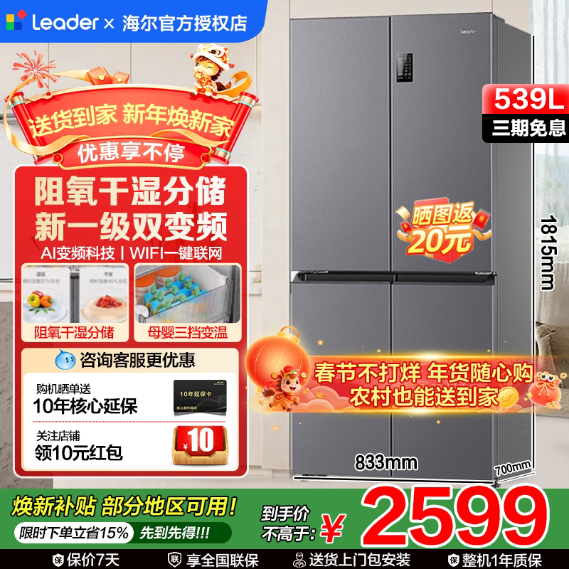 📚 焕新补| 海尔电冰箱大容量539升十字四门家用无霜Leader560一级