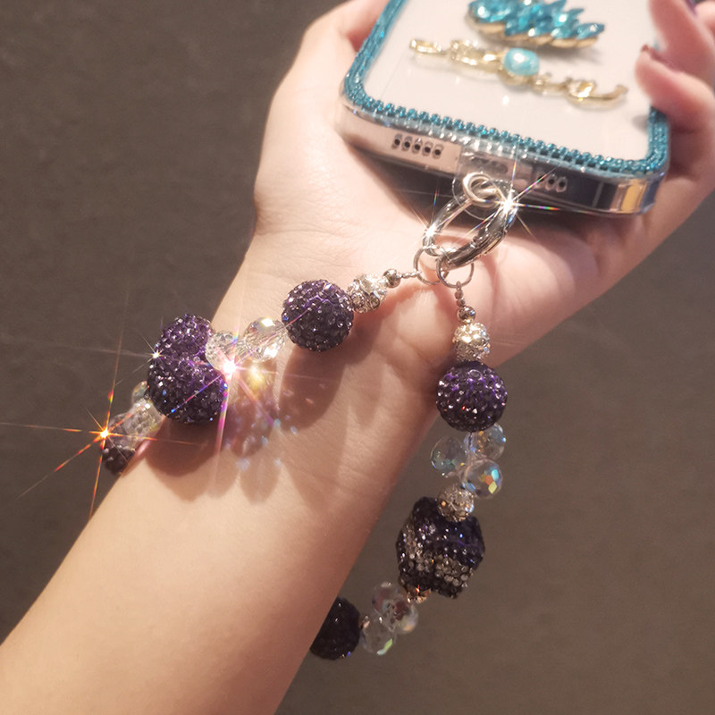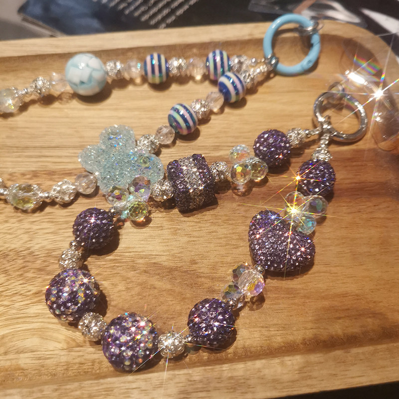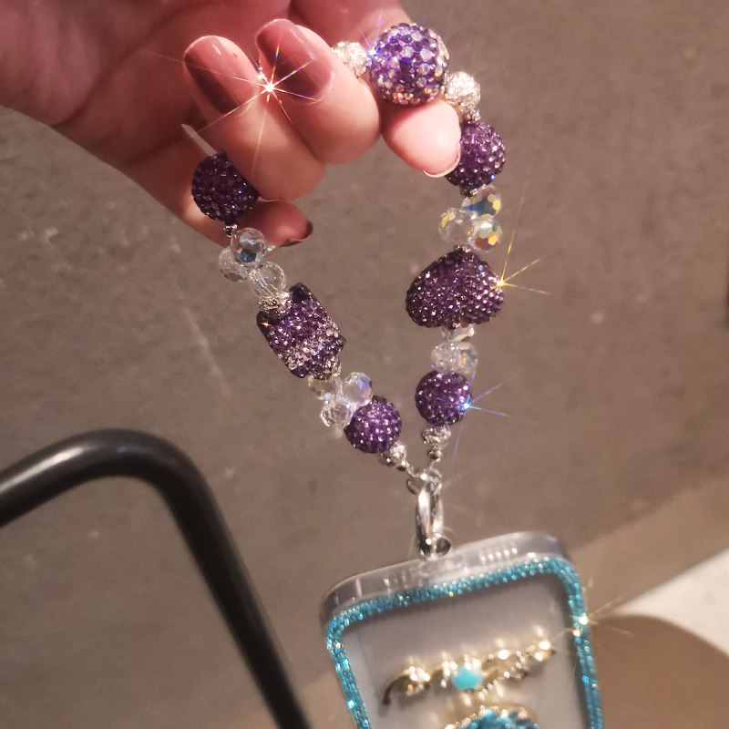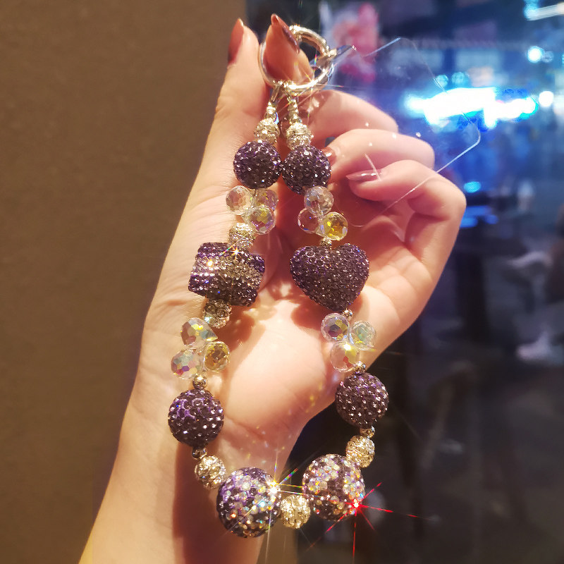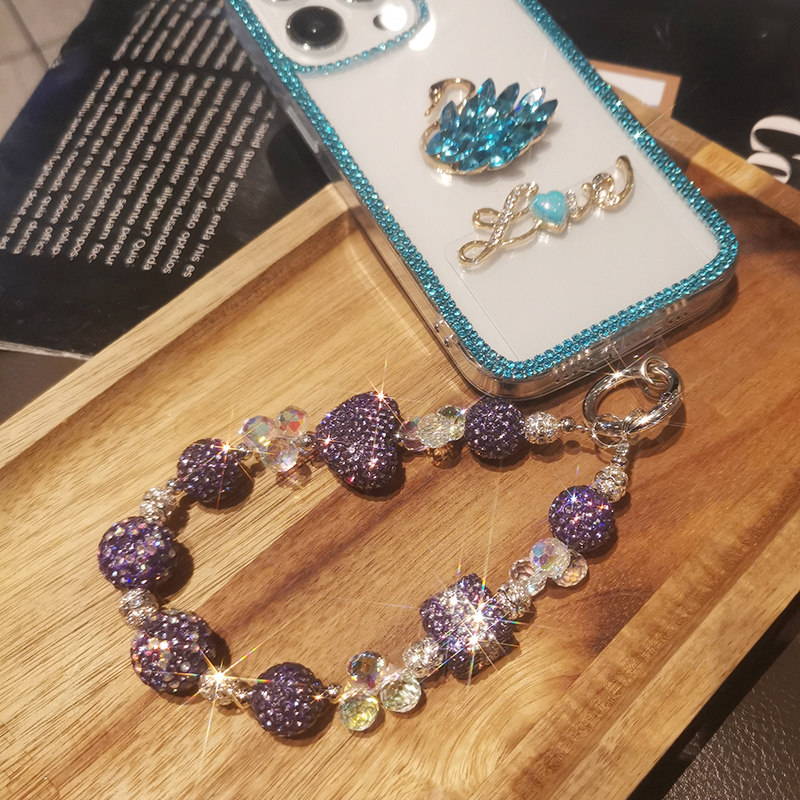 📚 手机挂绳密钻紫爱心水晶链夹片式接口处金属圈加固防断裂女款时尚ins轻奢风闪钻手工串珠链防摔手机保护绳