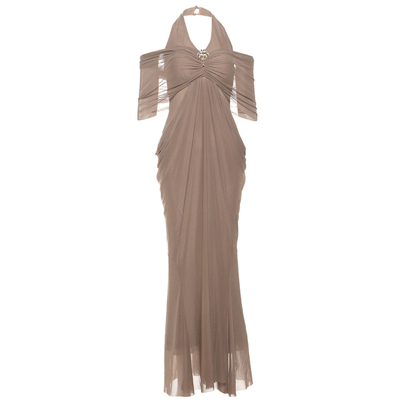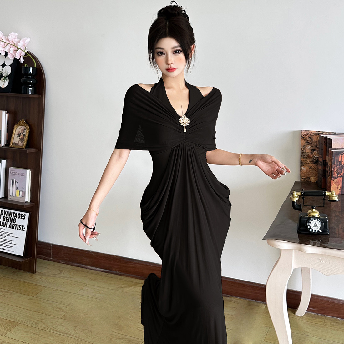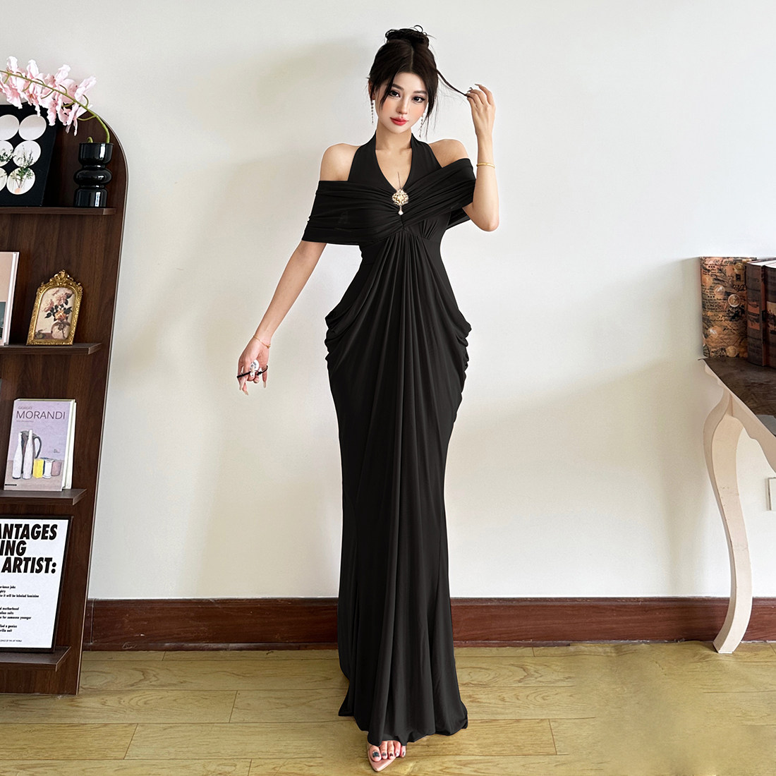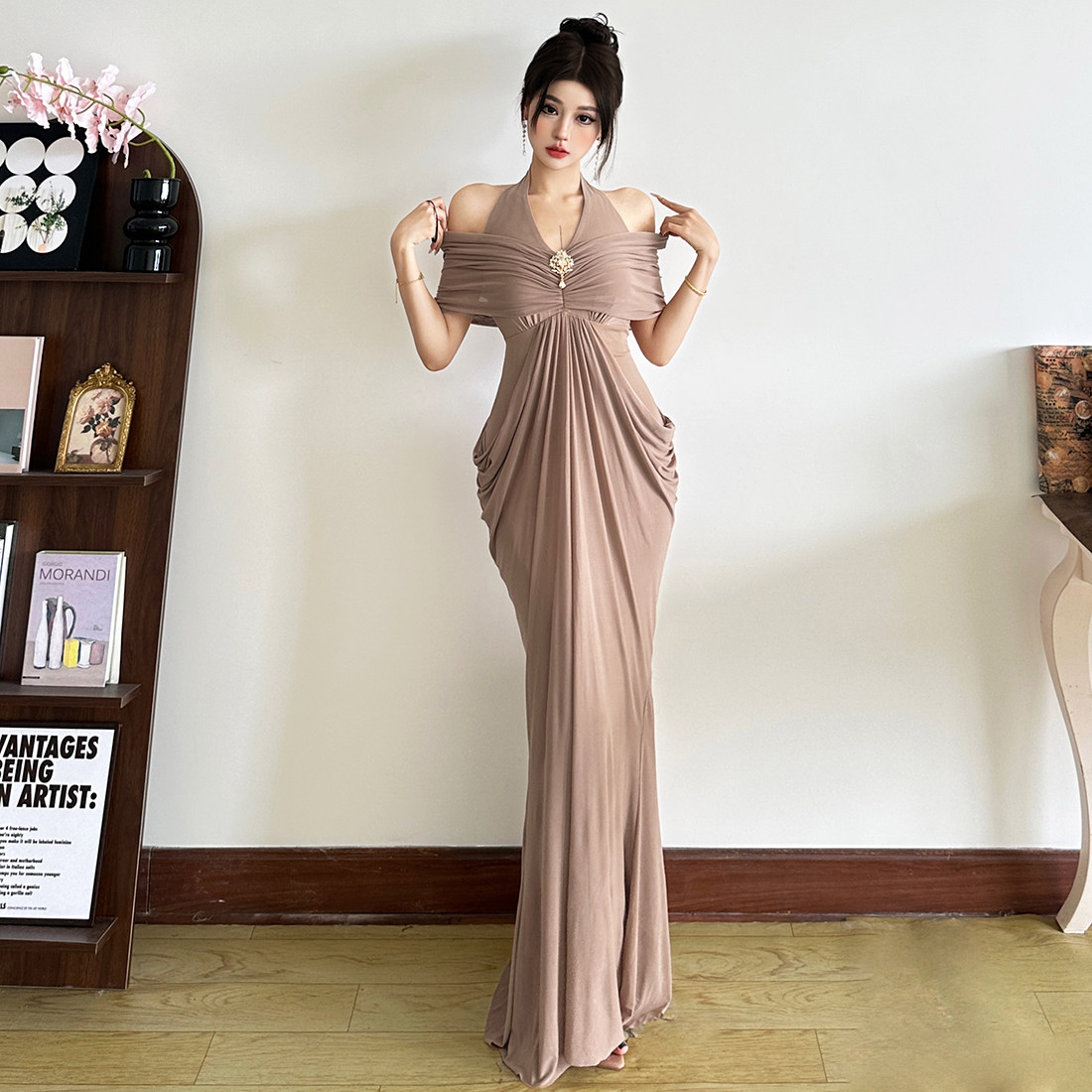 📚 #Sisjuly#法式优雅名媛 镶钻bling装饰褶皱垂坠设计挂脖连衣裙女