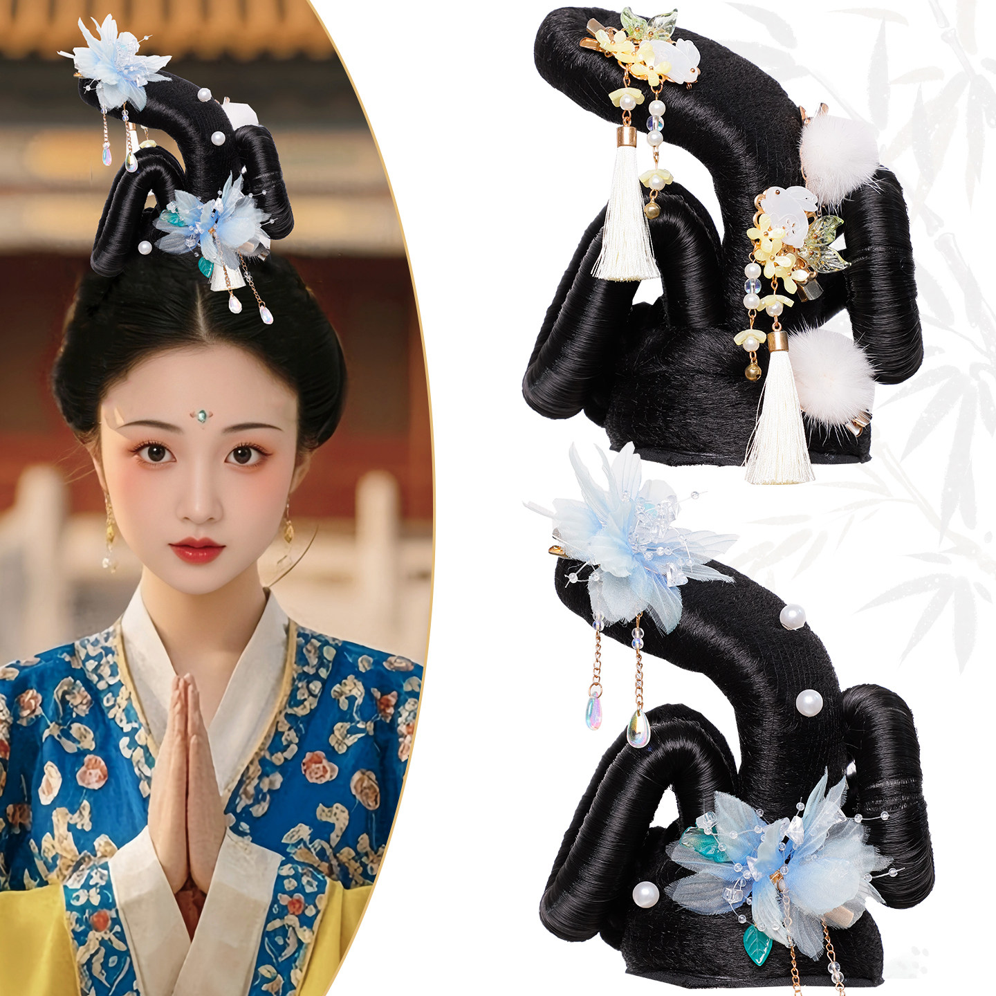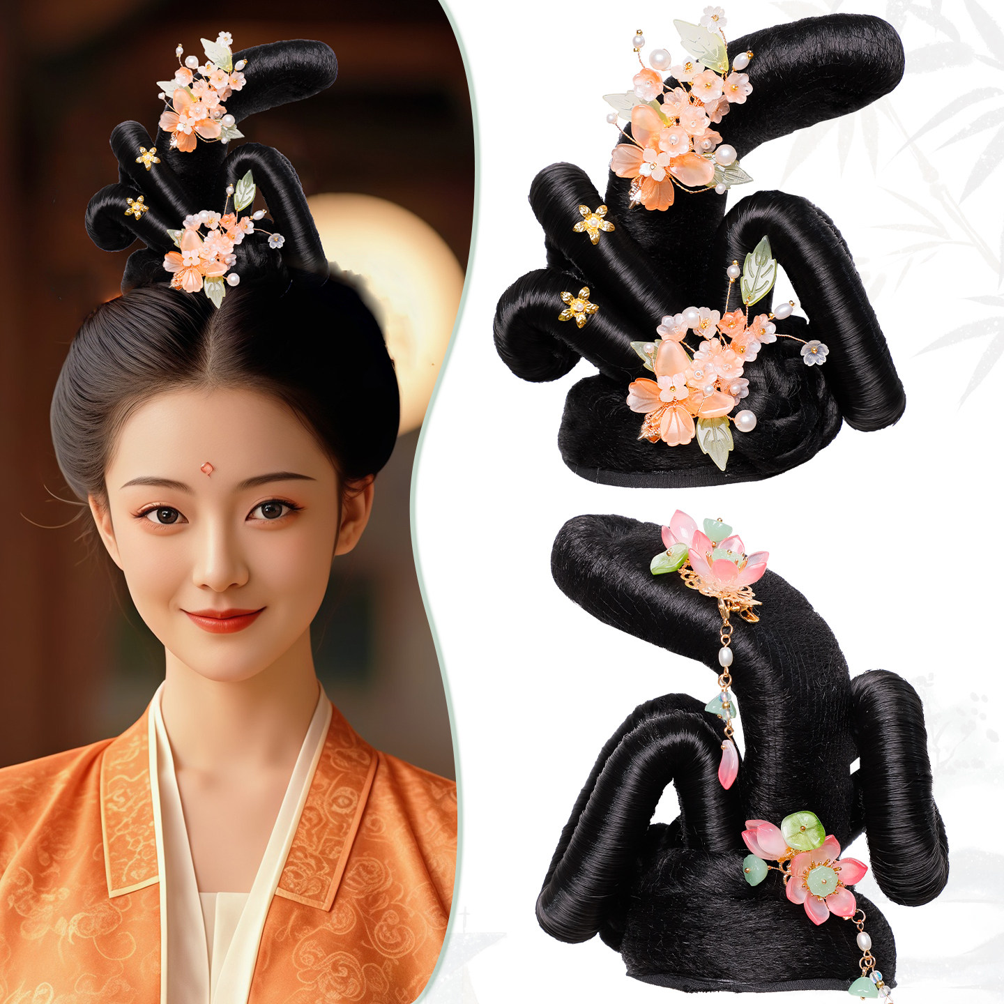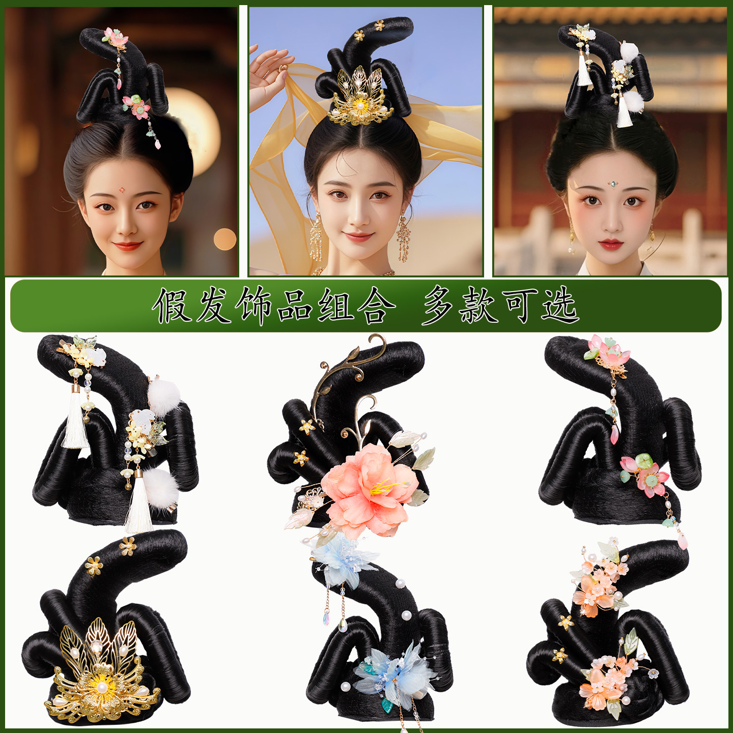 📚 古典唐风舞蹈假发头饰组合演出敦煌发髻古装发饰花朵配饰写真搭配