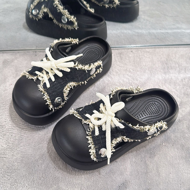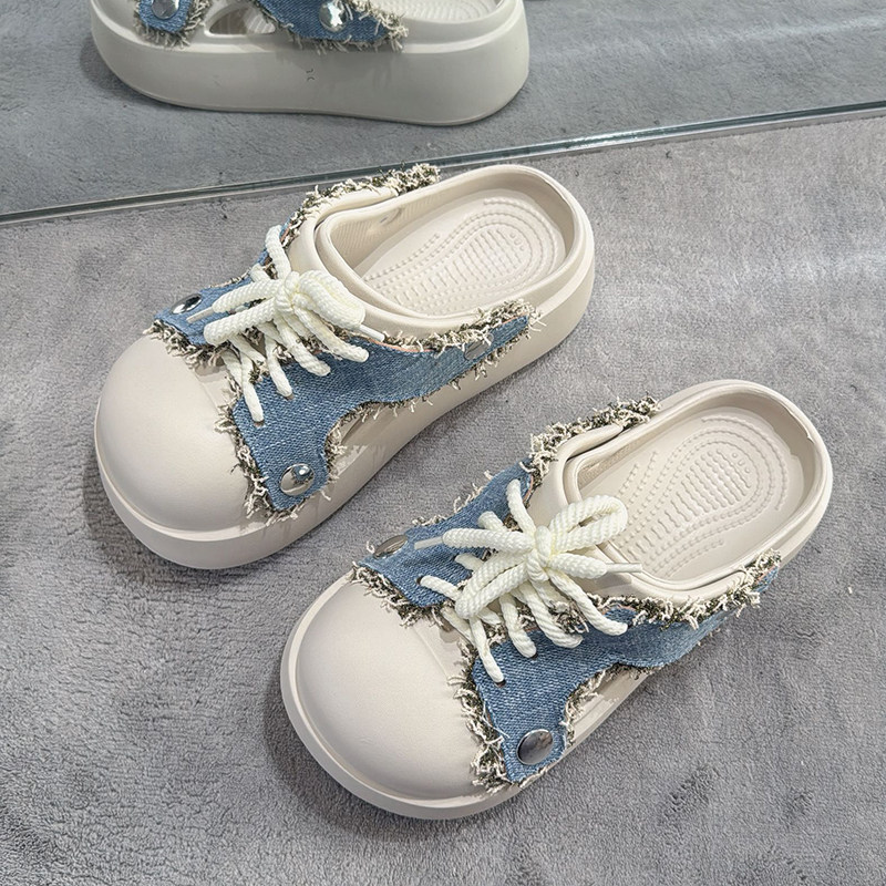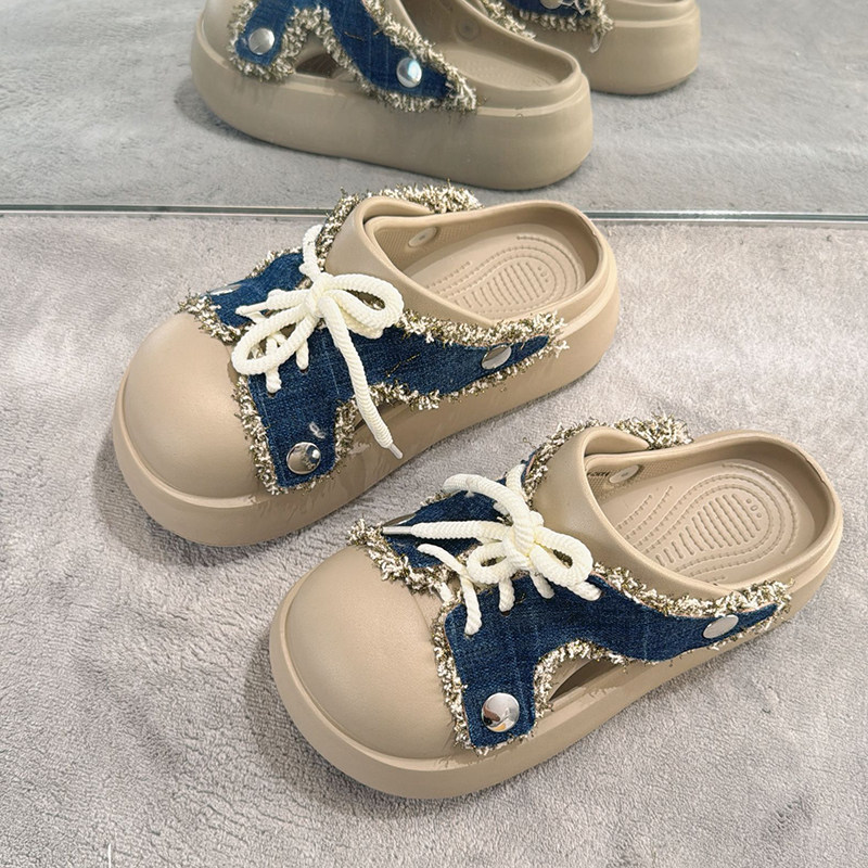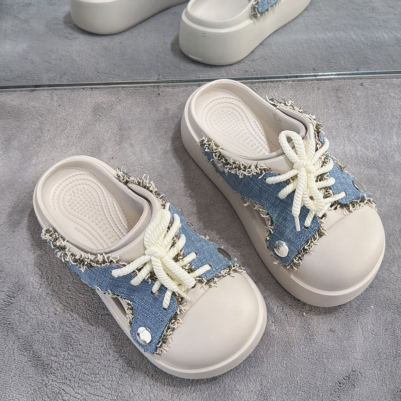 📚 牛仔风毛边包头拖鞋女夏外穿百搭洞洞鞋懒人凉拖鞋两穿厚底凉鞋潮