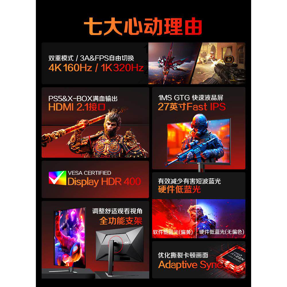📚 AOC双模4K显示器27英寸160Hz高刷U27G4电竞屏幕电脑32国补U27G4XM