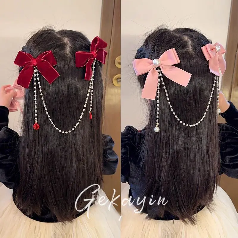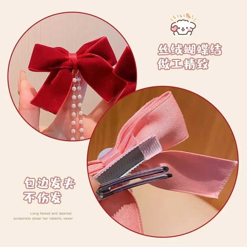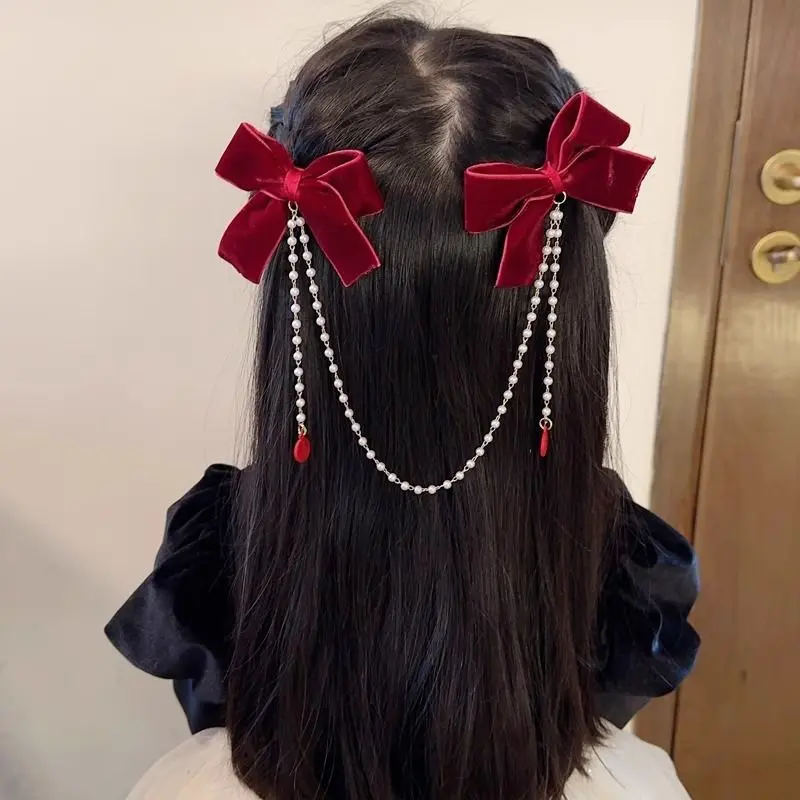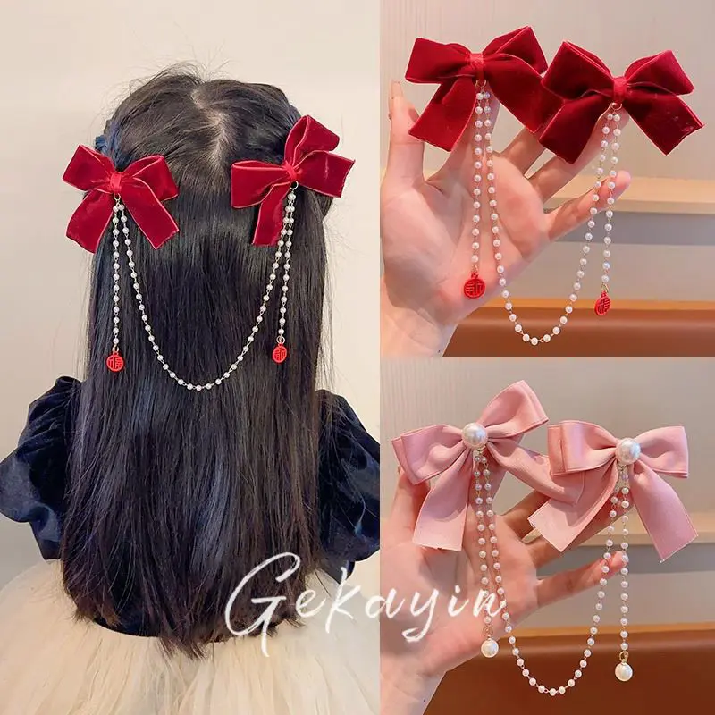 📚 女童蝴蝶结新年发饰红色过年秋冬儿童刘海发夹后脑勺女孩流苏发卡