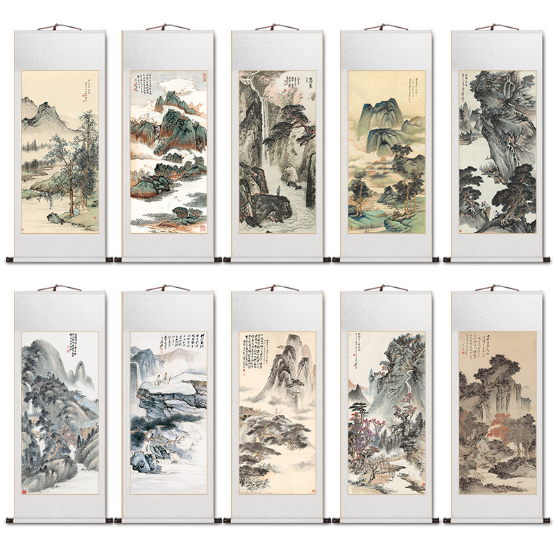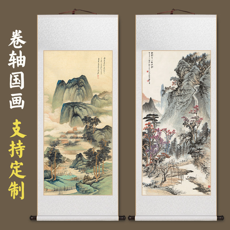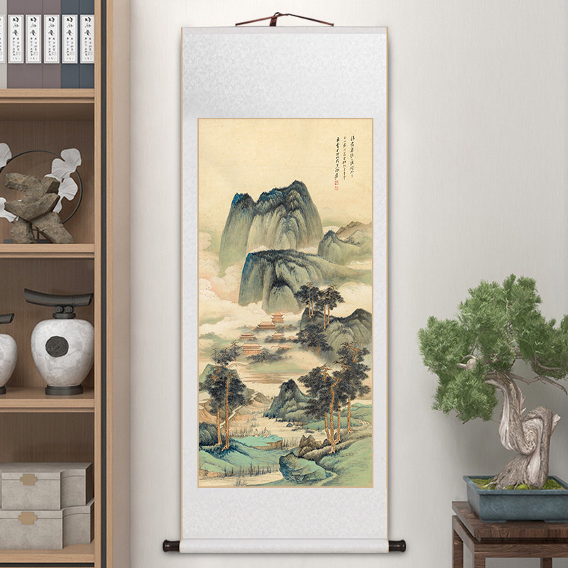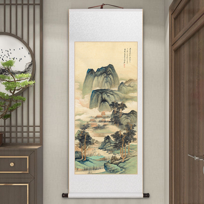 📚 张大千晴霭仙阁玄关画名家卷轴挂画新中式客厅装饰画办公室山水画