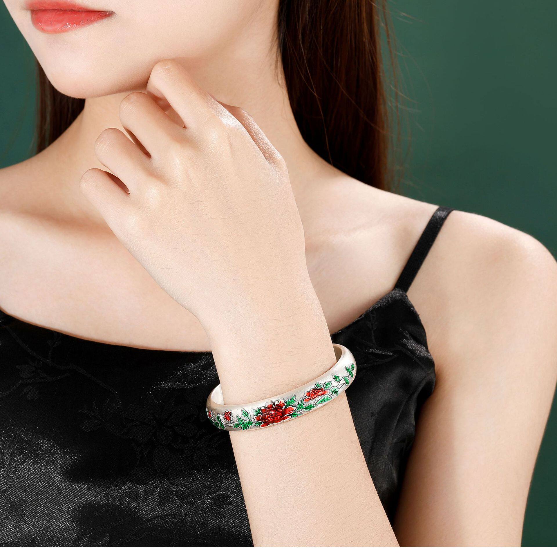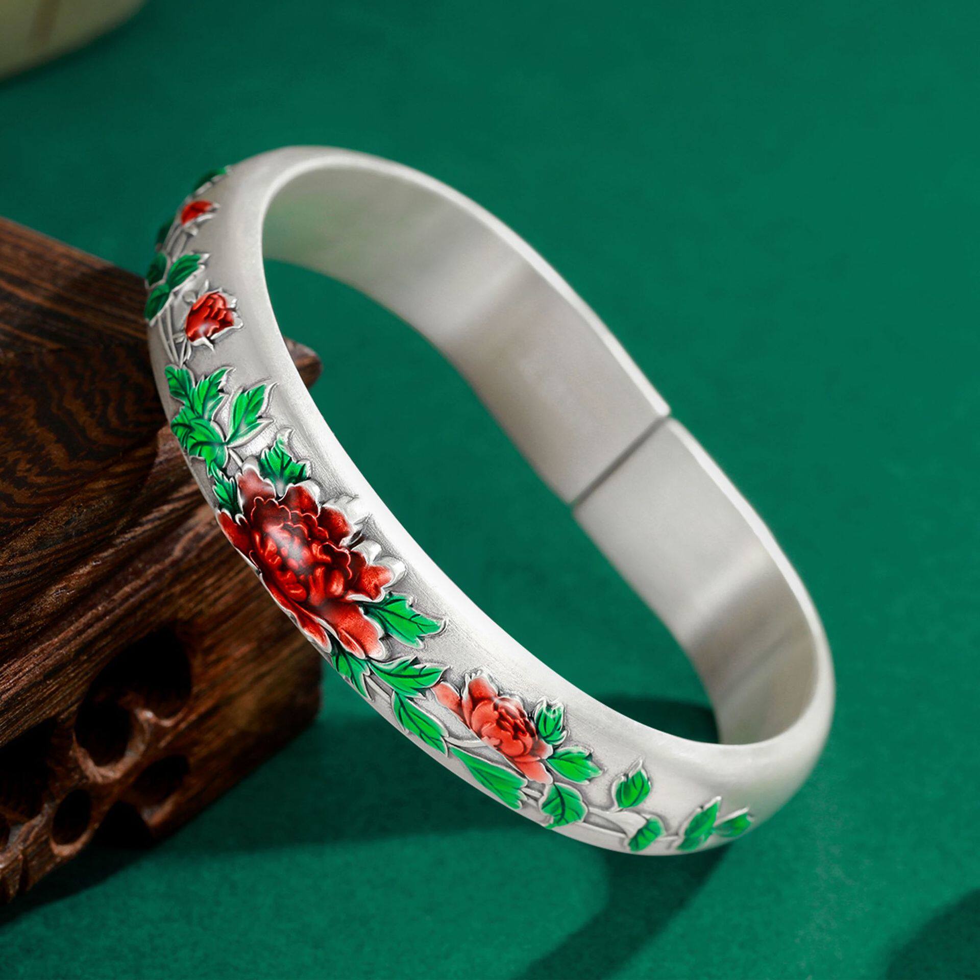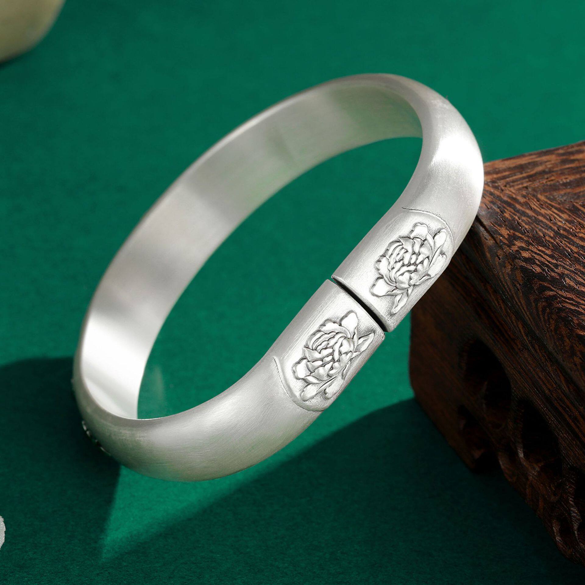 📚 银凤楼足银999牡丹花纯银手镯女款2026新款开口可调节马蹄银镯子