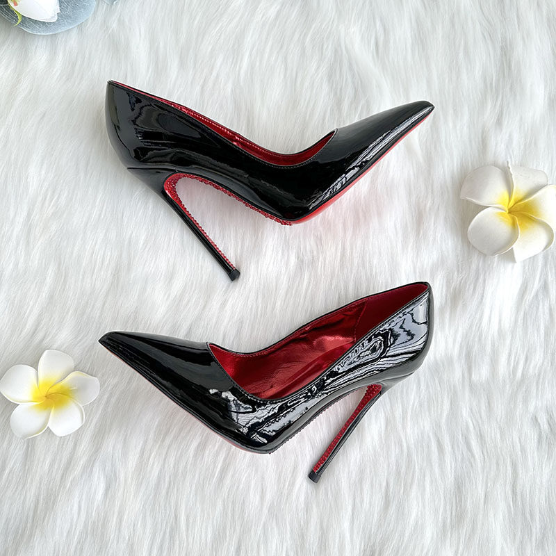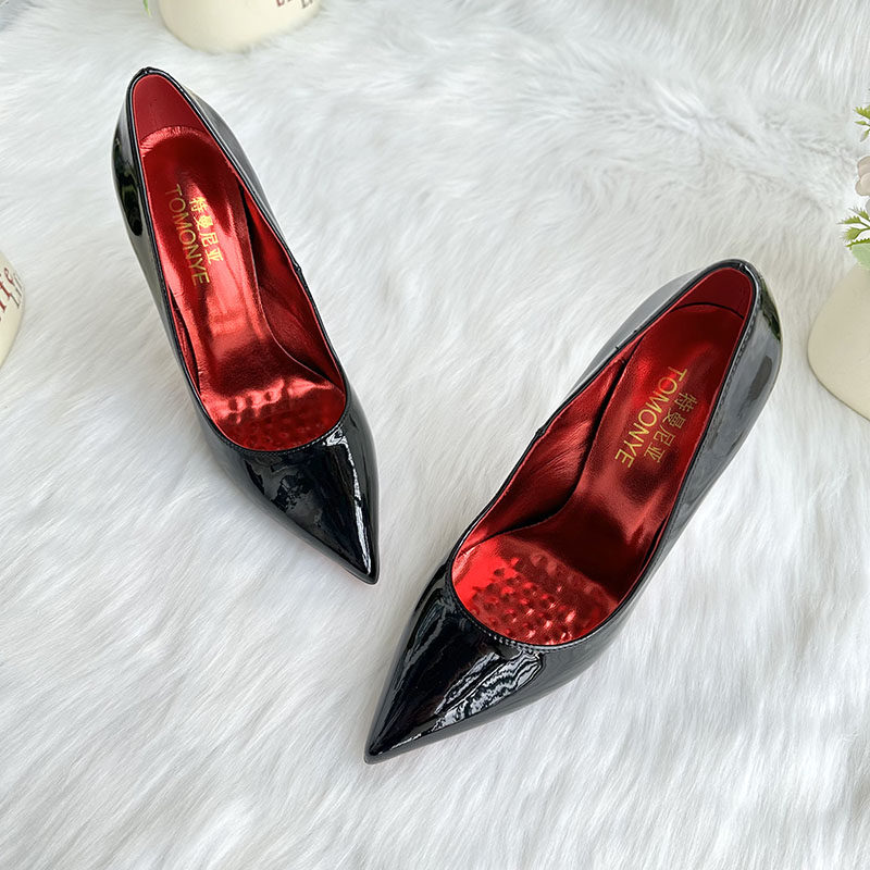 📚 2024早春新款水钻底高跟鞋黑色漆皮全包性感锥形超细跟大小码单鞋