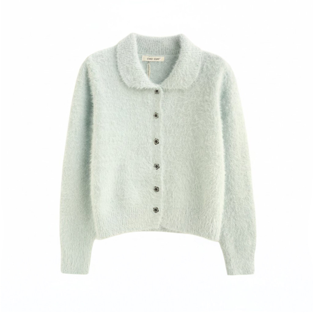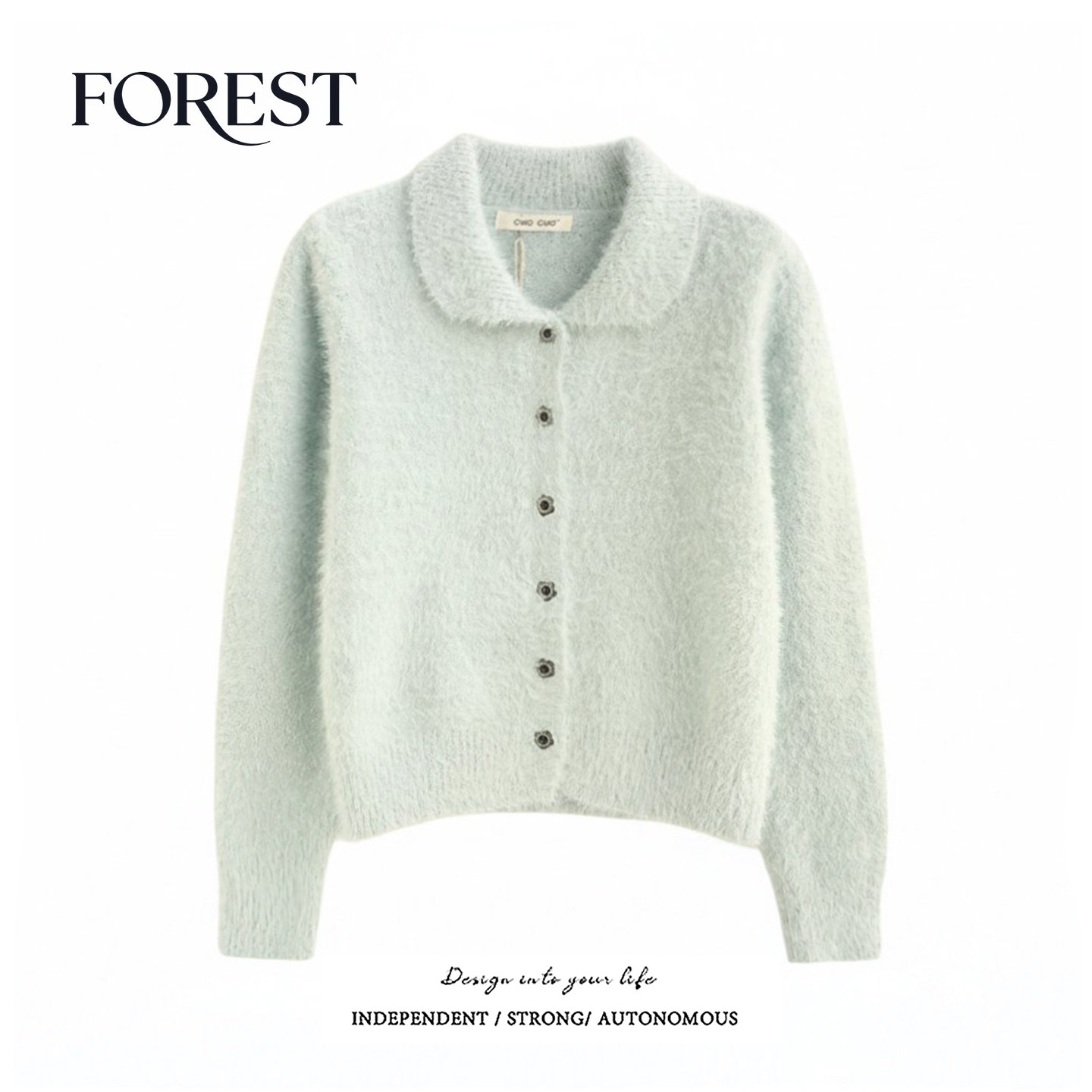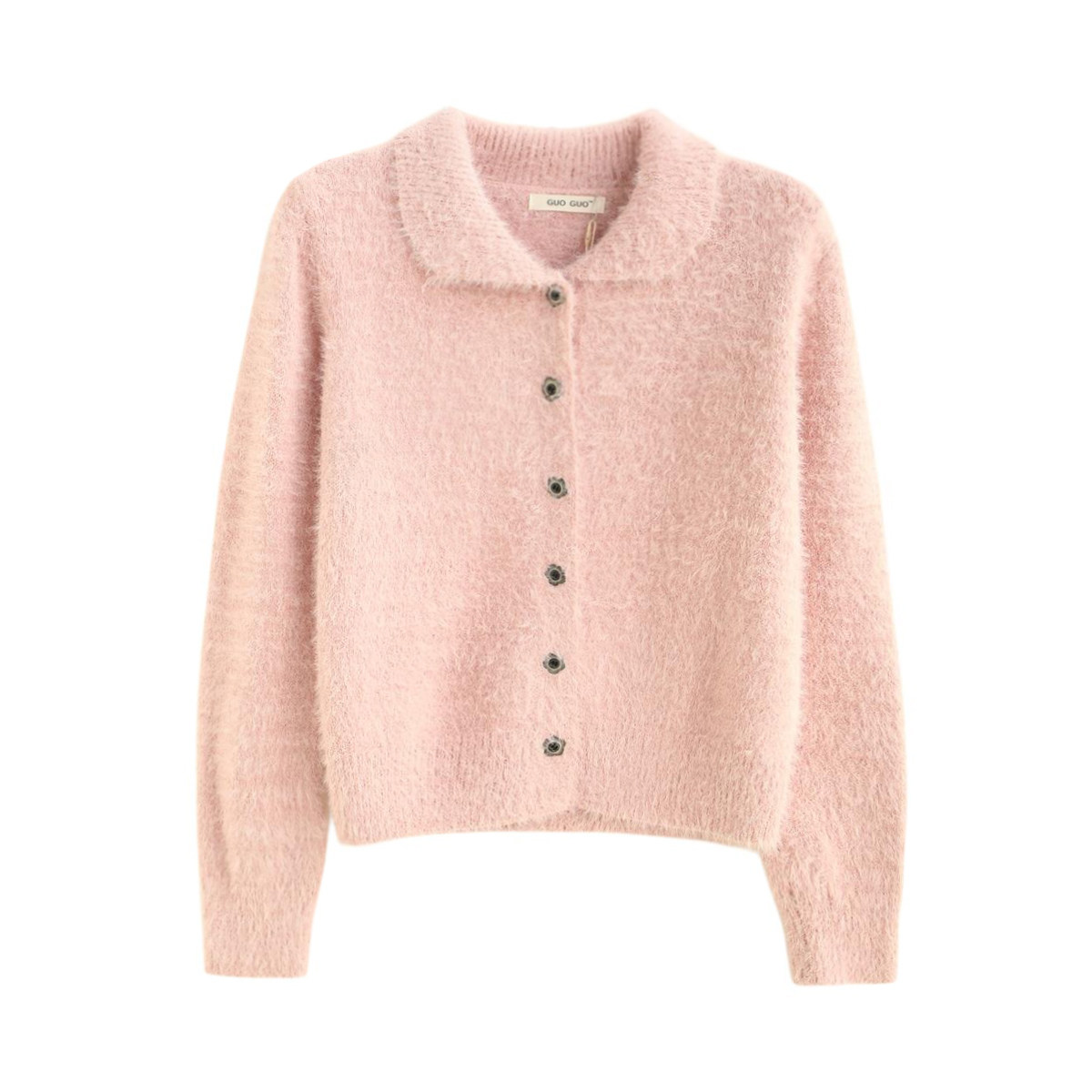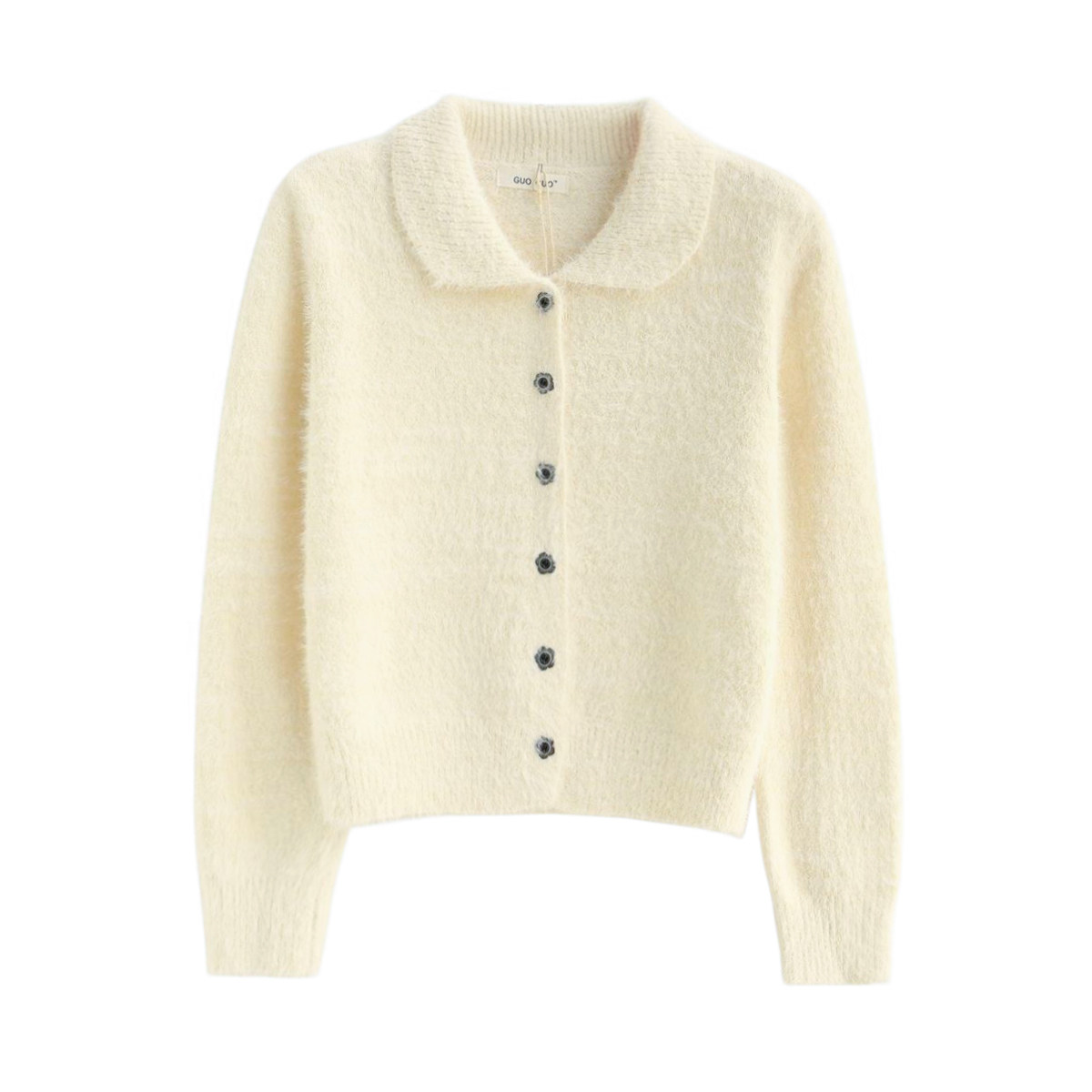 📚 拾野森 冬装新款韩系短款水貂毛花朵扣长袖娃娃领毛衣开衫外套