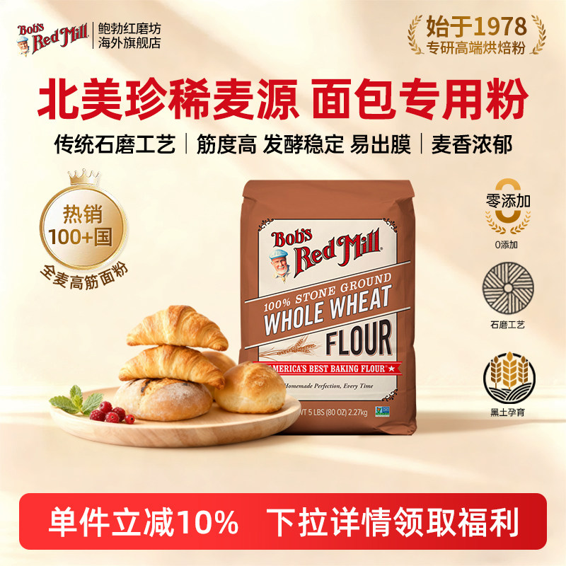 📚 鲍勃红磨坊进口全麦高筋面粉面包专用面粉家用小麦面粉5斤粗粮