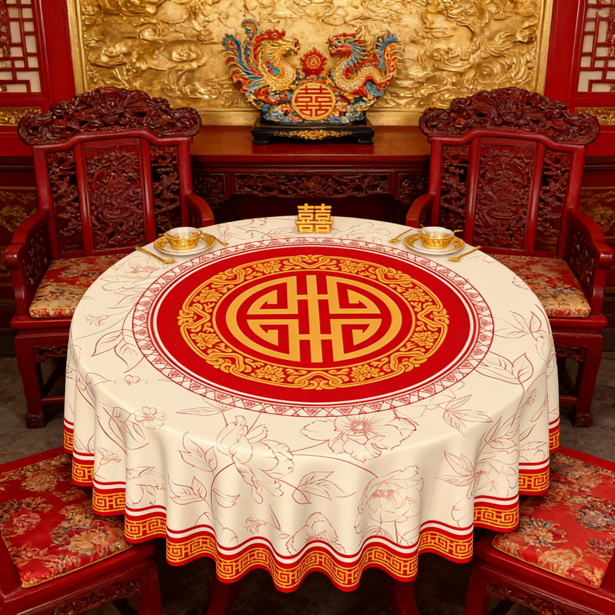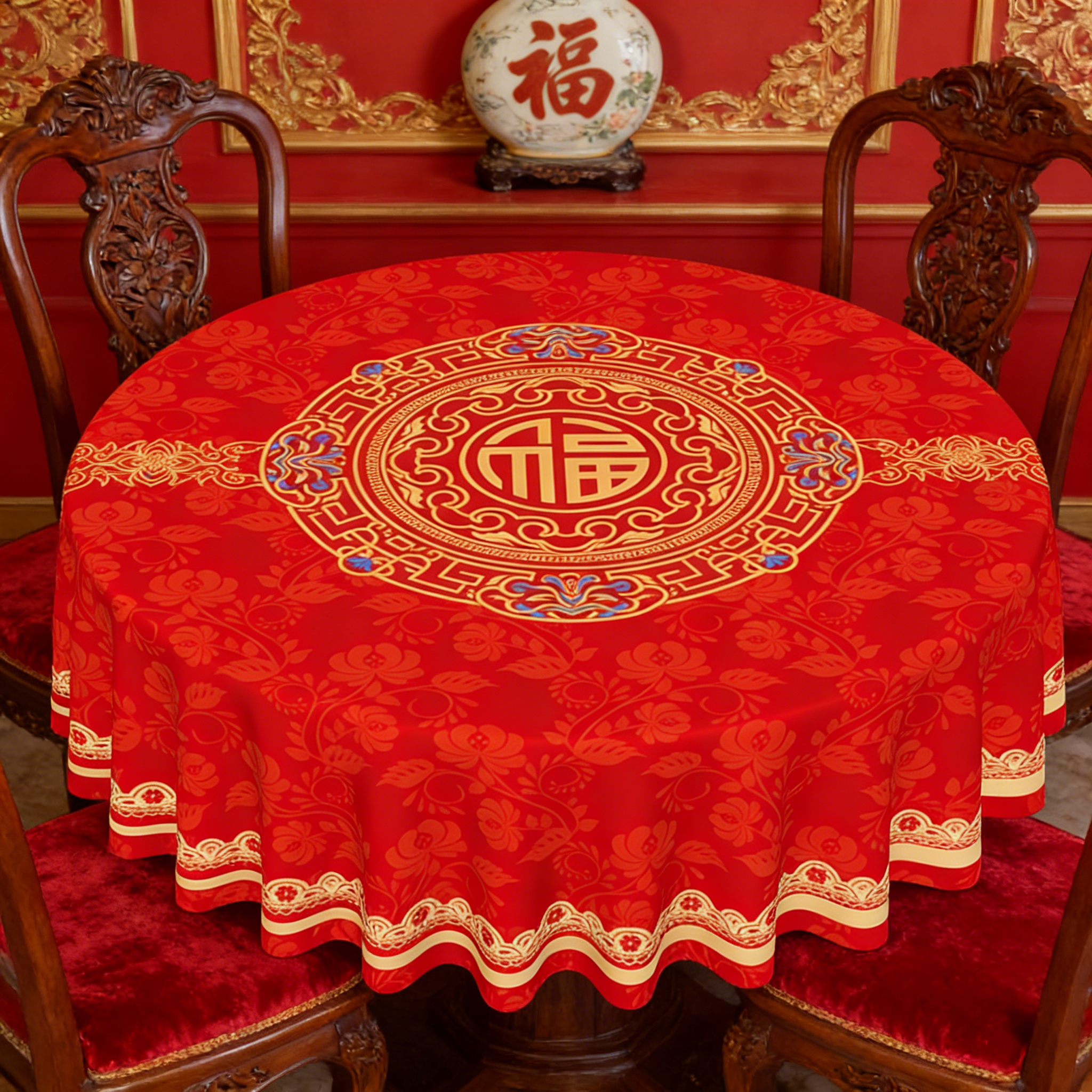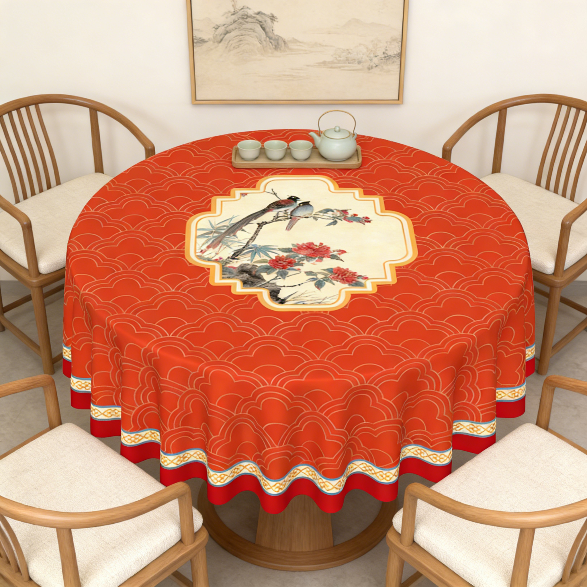 📚 红色新中式圆形桌布PVC防水防油防滑免洗桌布喜庆中国红餐桌台布