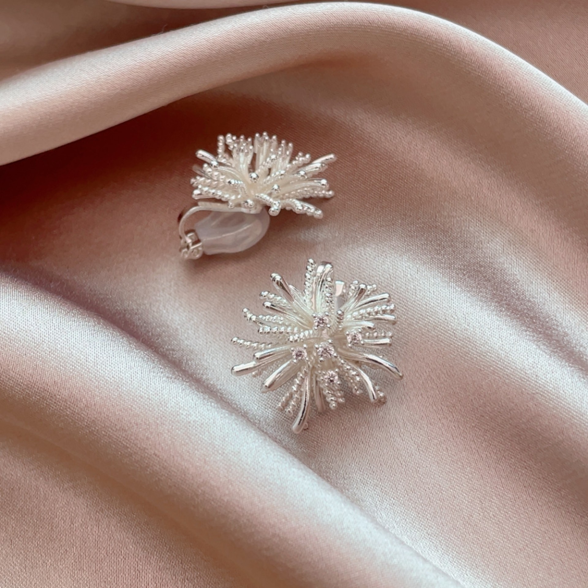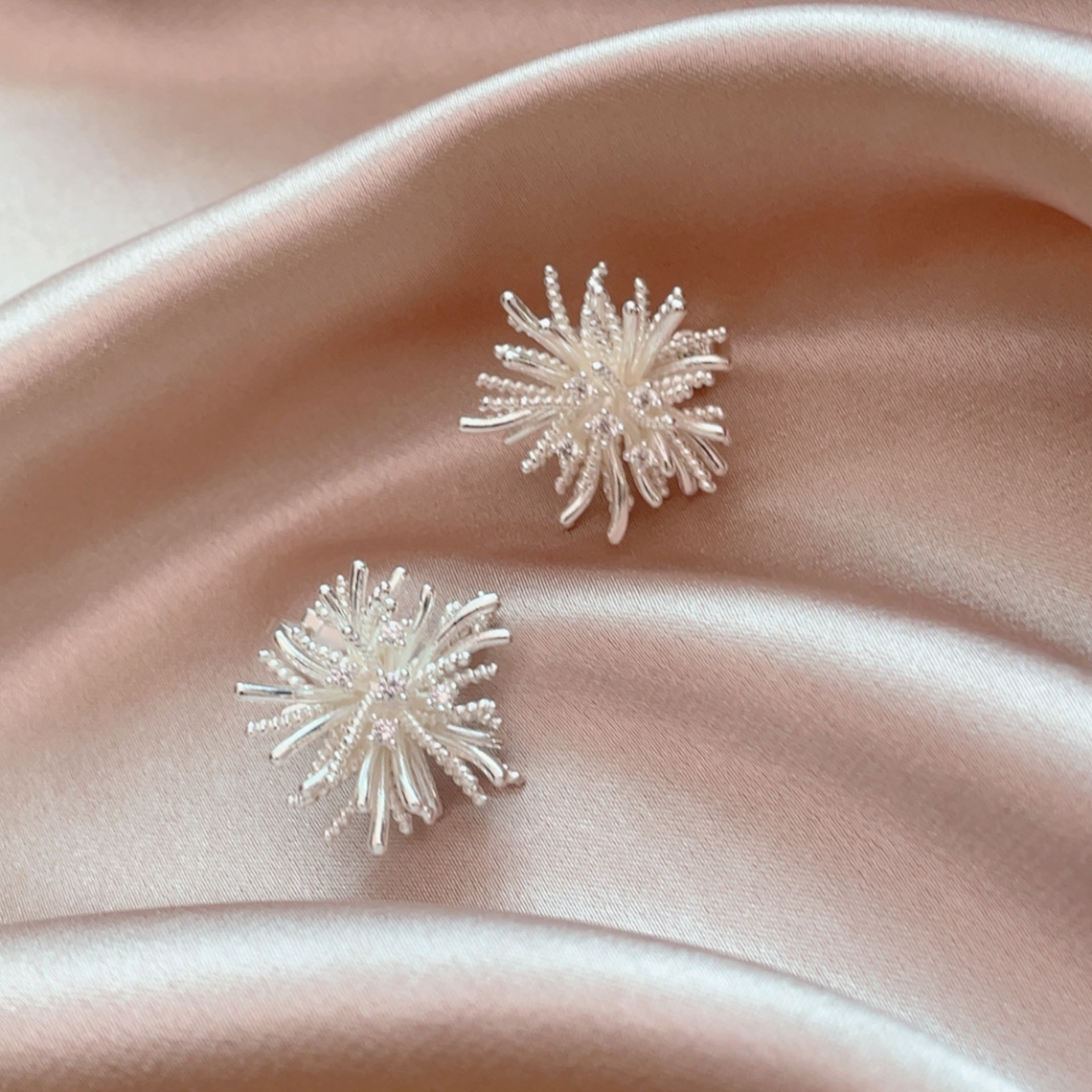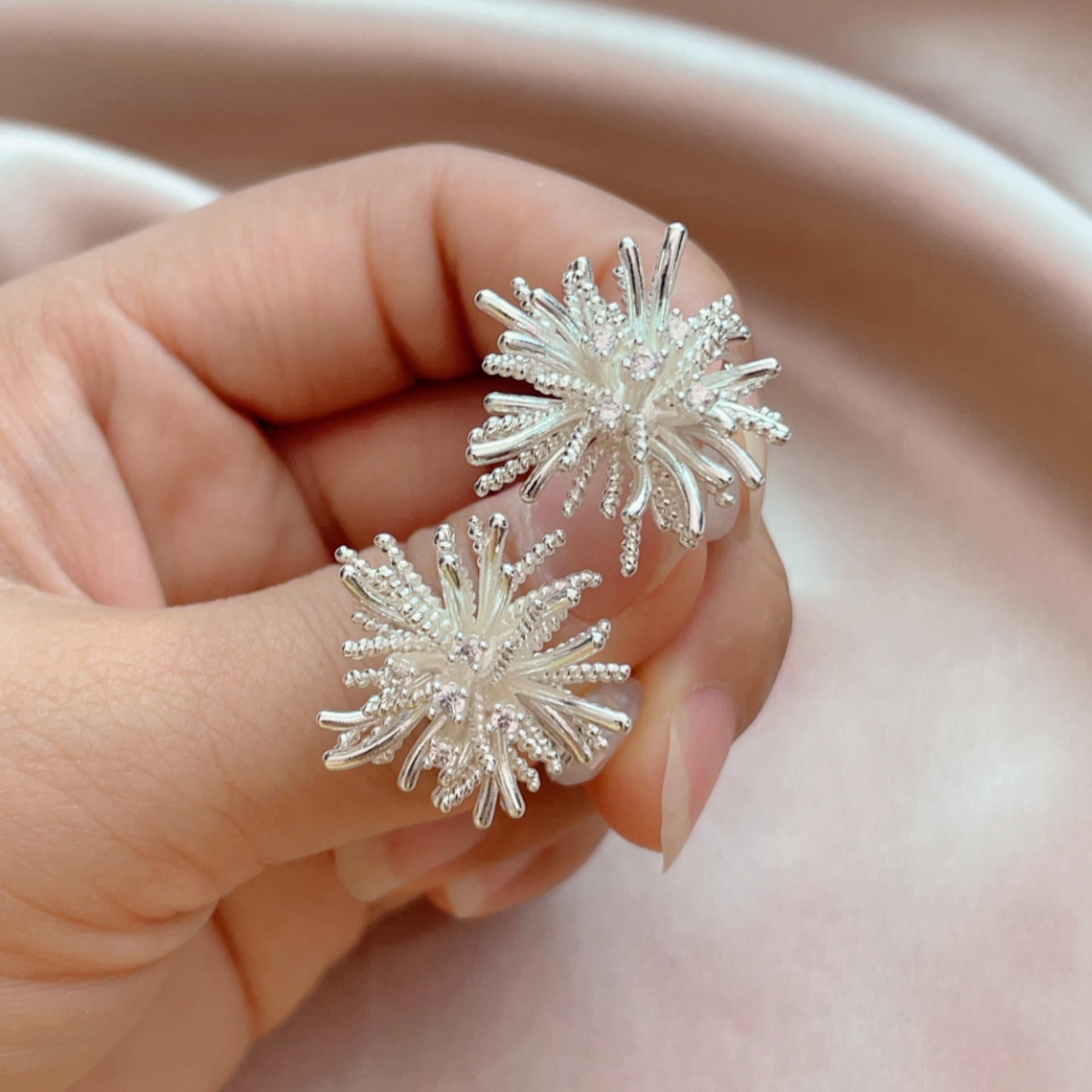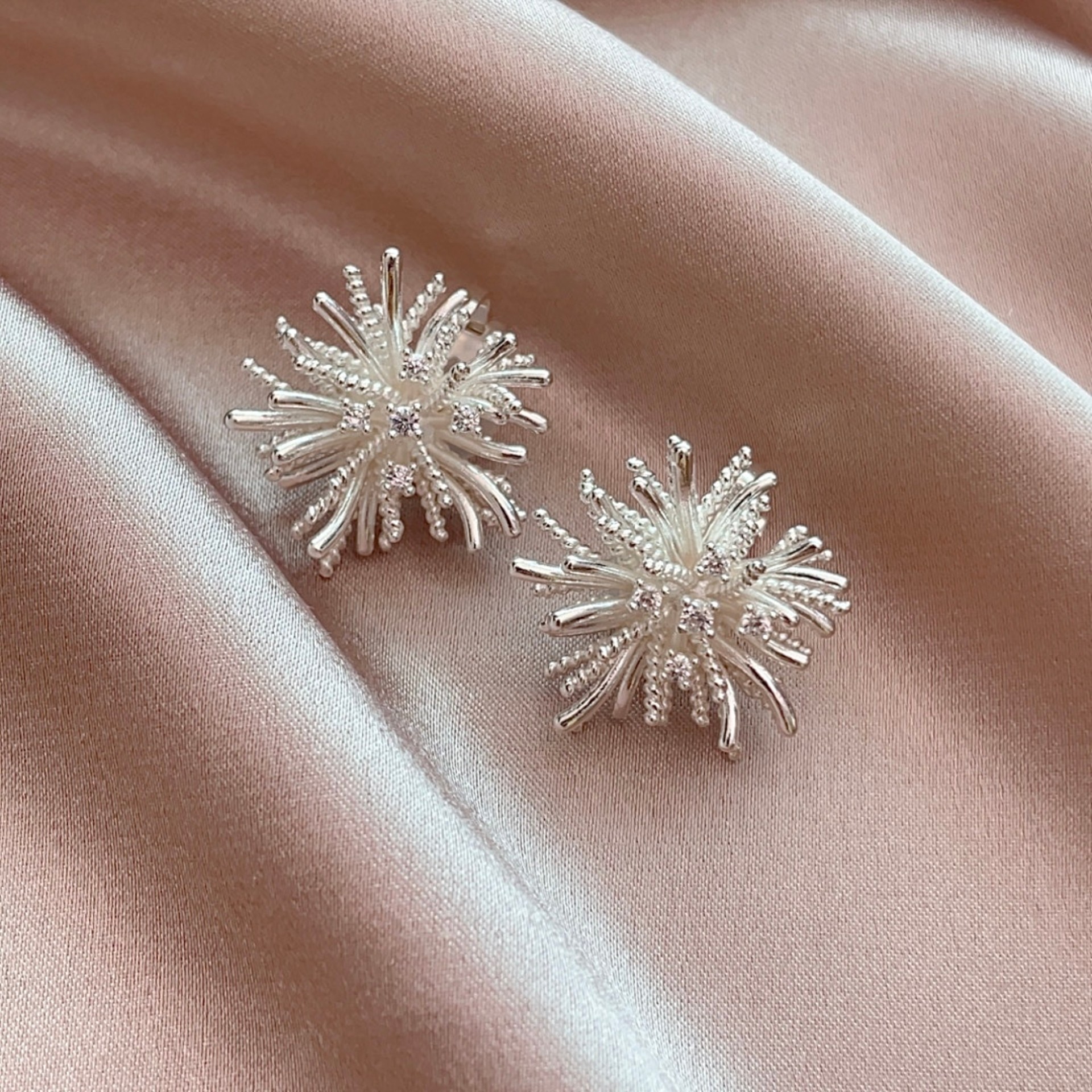 📚 超美闪耀银白色立体烟花耳环2025流行无耳洞气质蒲公英耳钉免打孔