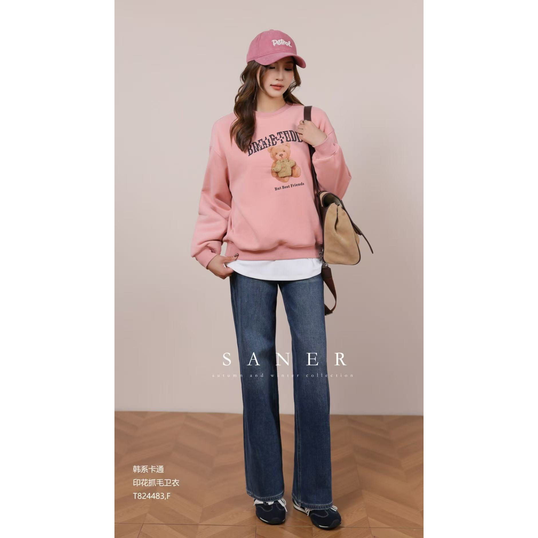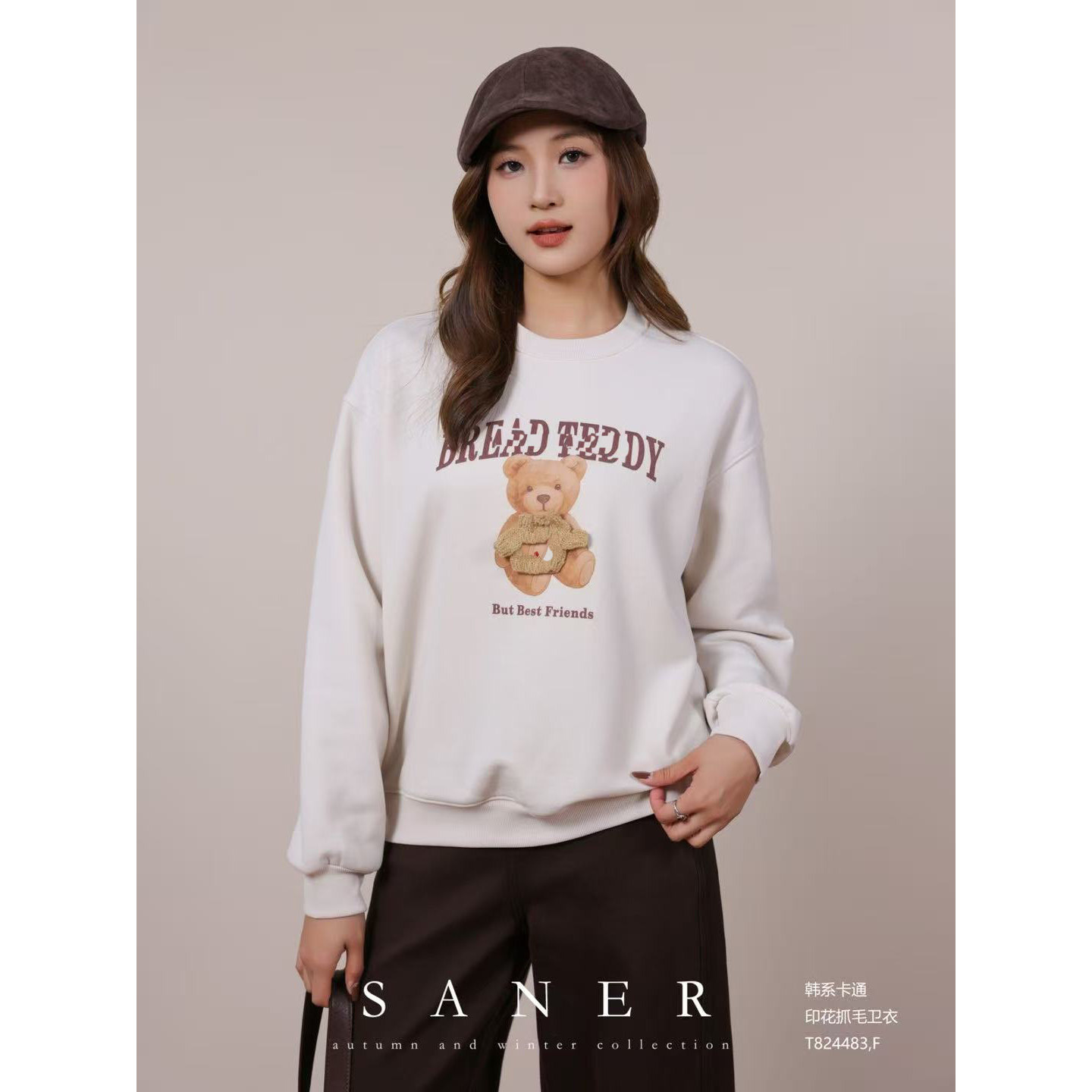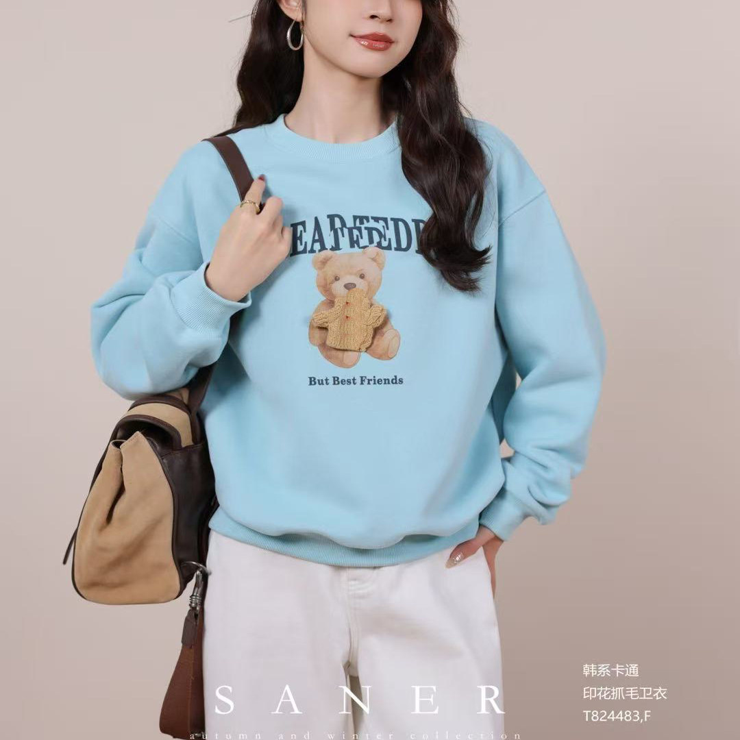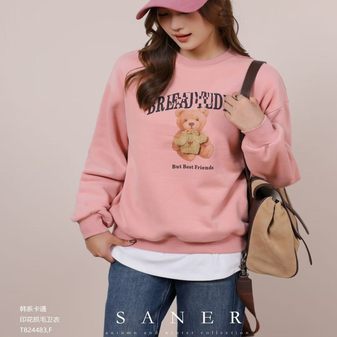 📚 特价SANER欧货2025秋冬新女824483韩系小熊印花抓绒宽松显瘦卫衣