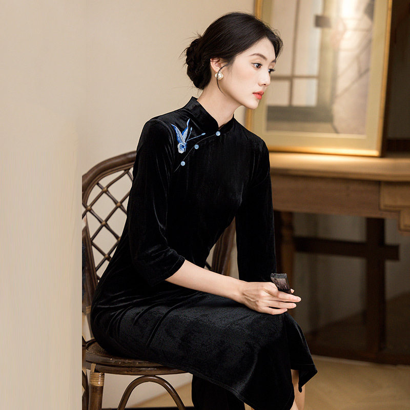 📚 黑色丝绒改良旗袍裙2026新款女七分袖中长款修身显瘦复古风连衣裙