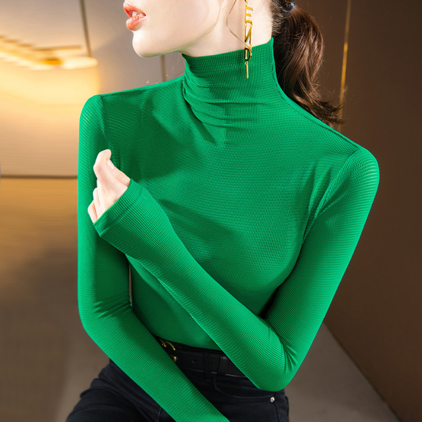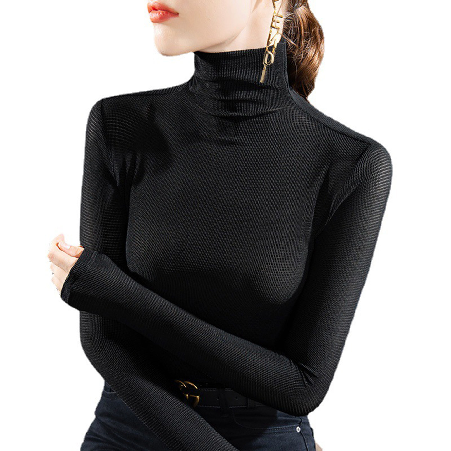📚 2025新款高领黑色薄纱打底衫女长袖薄款沙衣网纱t恤微透上衣秋装