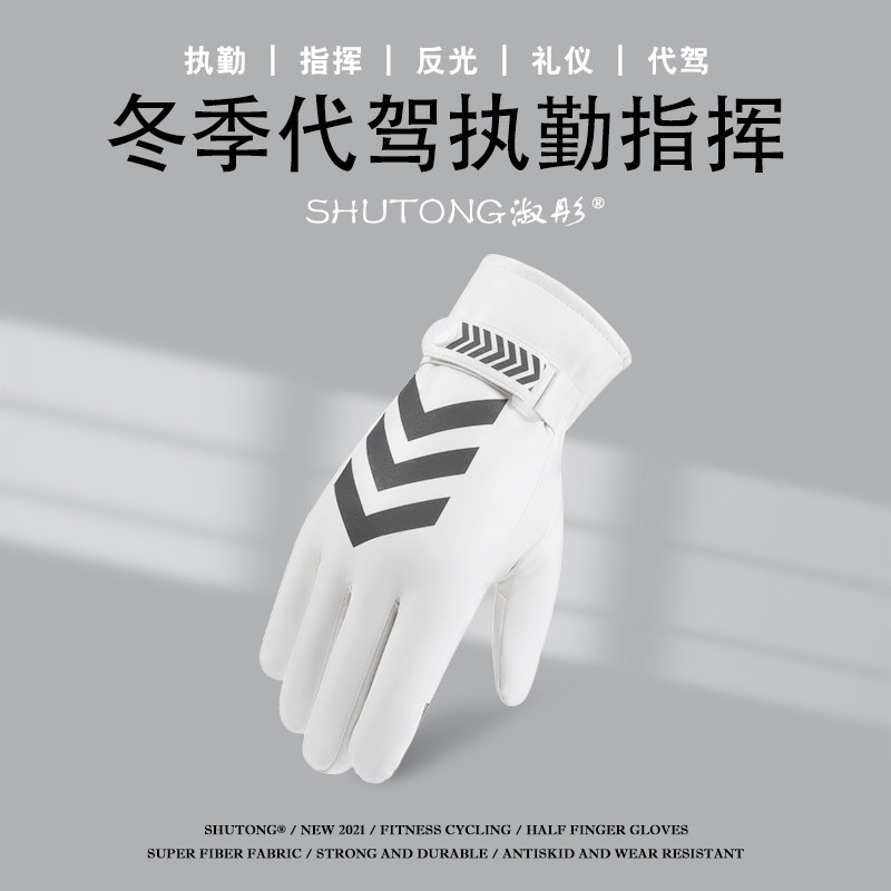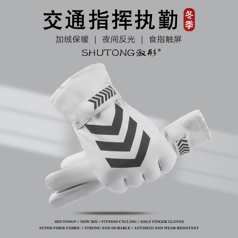 📚 交通手套白色男冬季加绒安保巡逻指挥执勤反光触屏路政防水防风