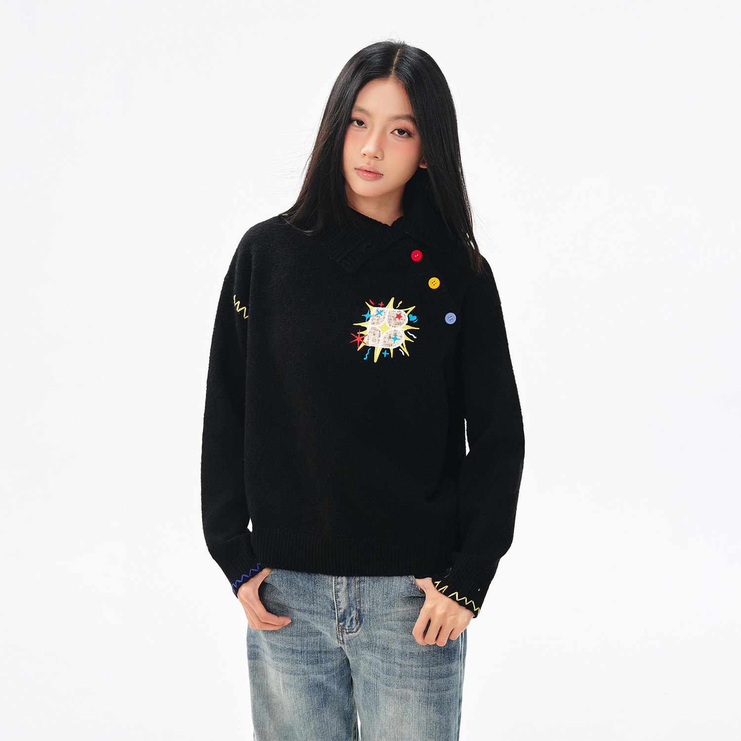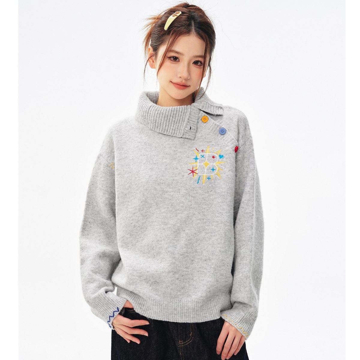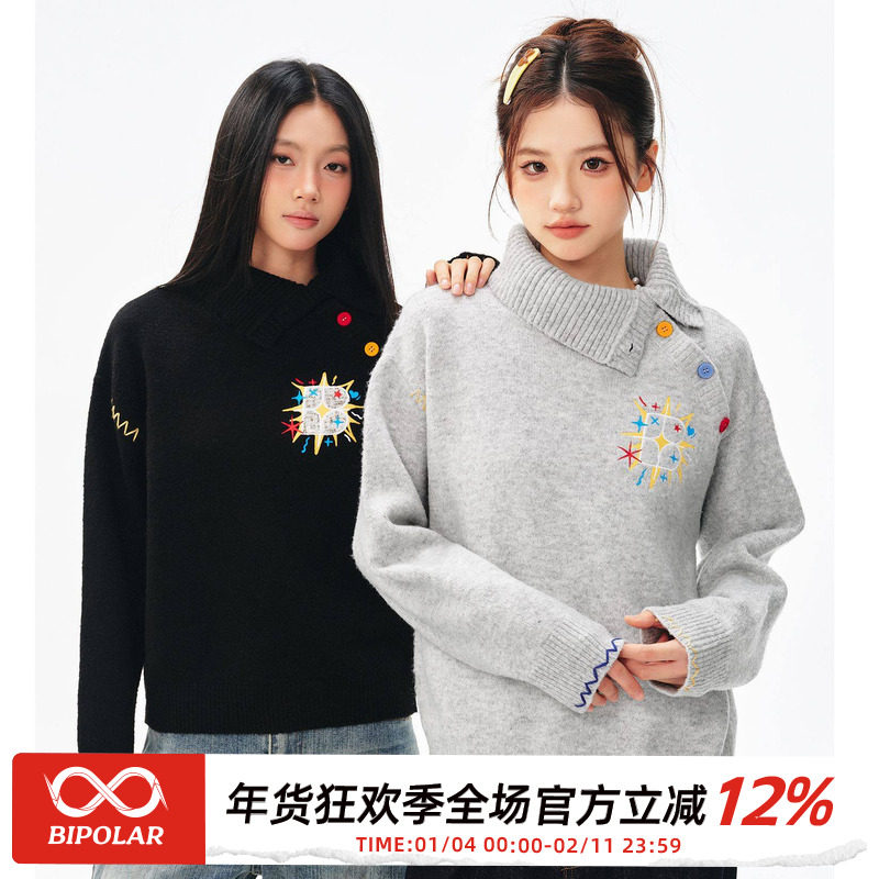 📚 BIPOLAR女款斜领彩色纽扣针织时尚休闲情侣宽松保暖毛衣秋冬新款