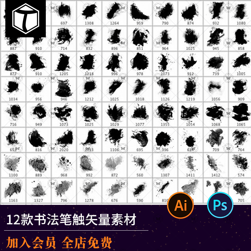 📚 中国潮风水墨书法笔触笔画毛笔字体设计飞白溅墨笔刷矢量做字素材