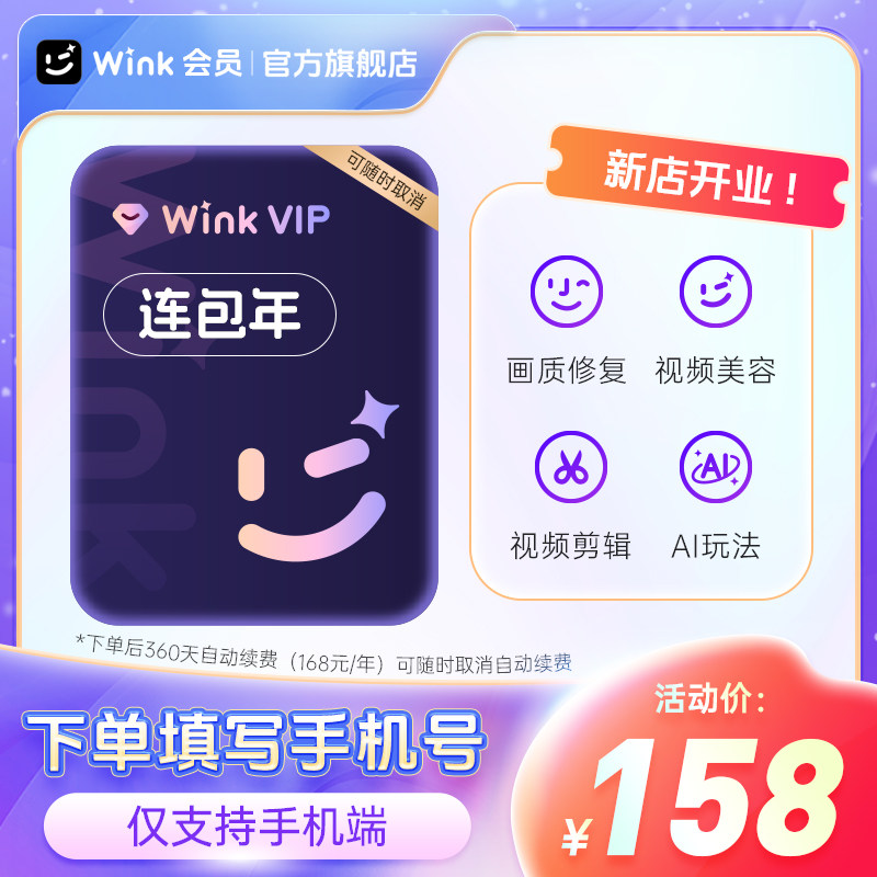 📚 【连续包年】Wink VIP会员年卡12个月 AI视频超清剪辑手机去水印