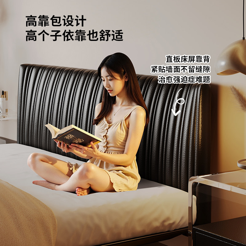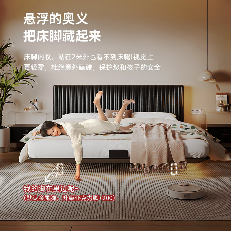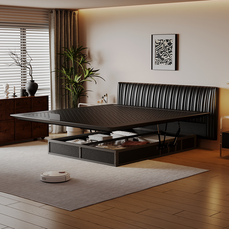 📚 意式极简床悬浮真皮床主卧高端大气黑色床碳素钢铁艺床平移储物床