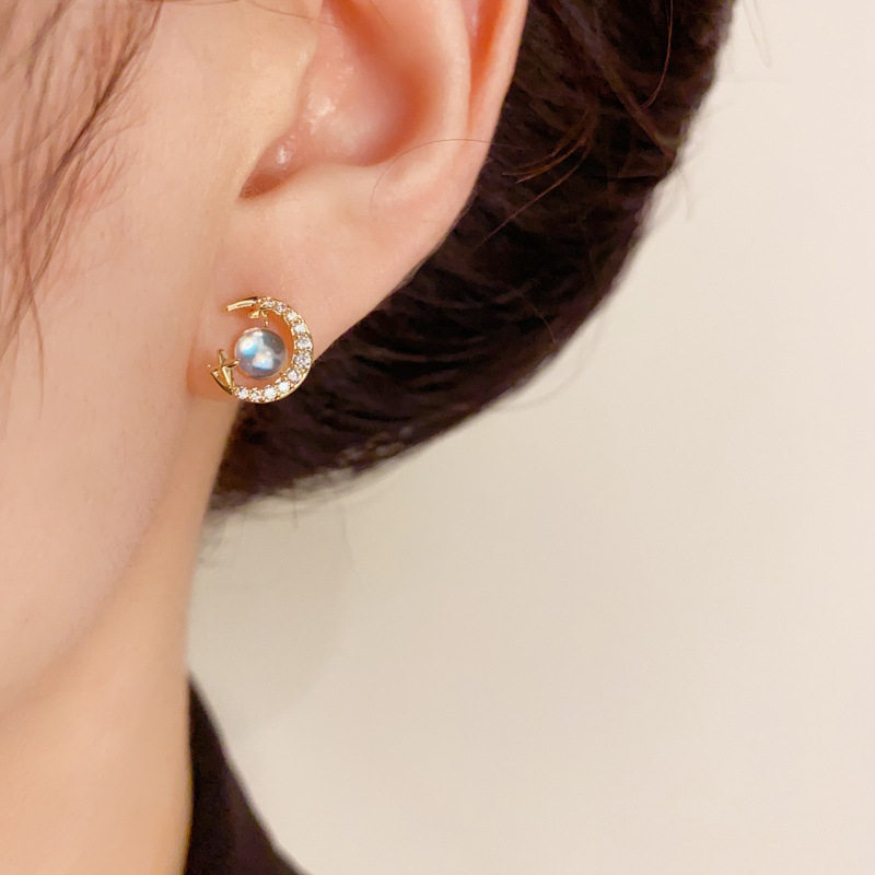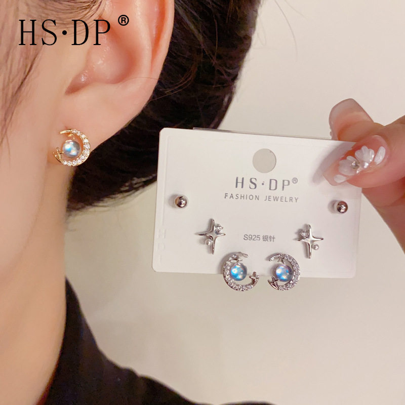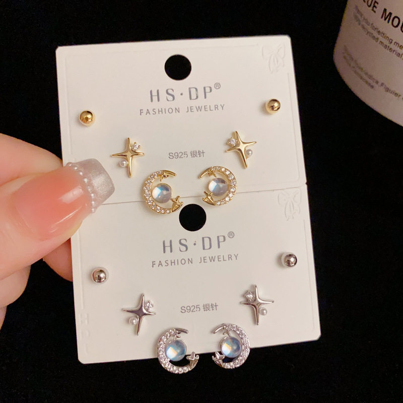 📚 s925银针轻奢锆石星月彩珠三对装耳钉时尚简约小巧百搭耳环