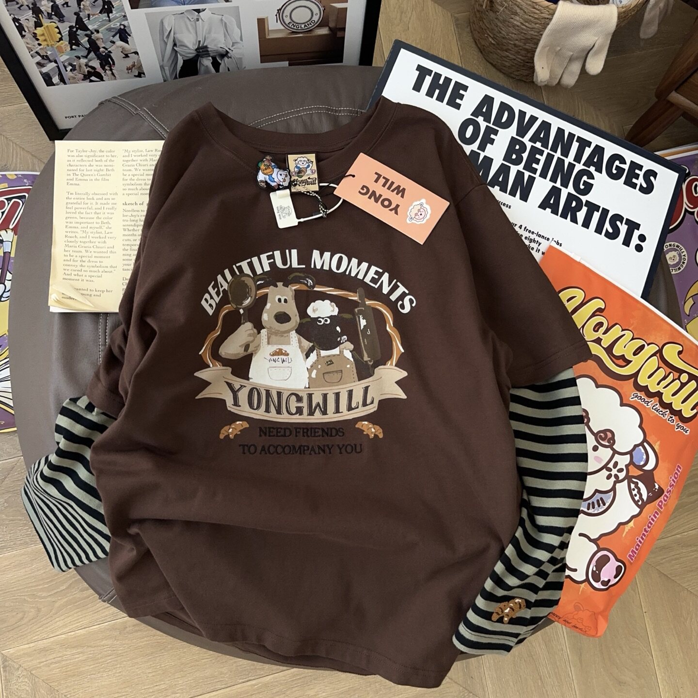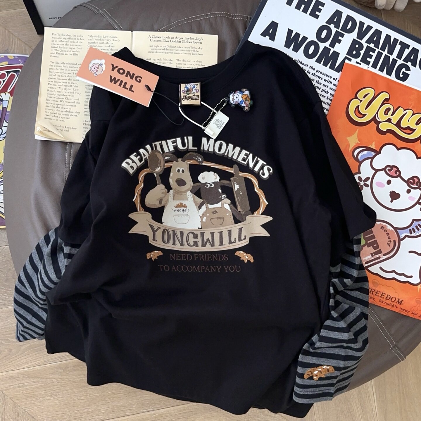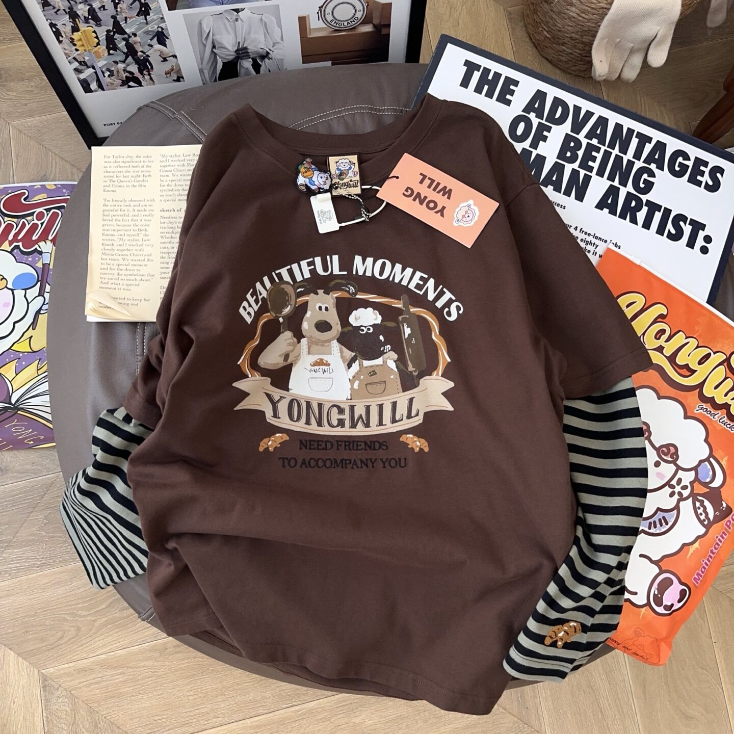 📚 超乎预期de搭!yongwill小羊纸袋家假两件设计250g纯棉长袖T恤女