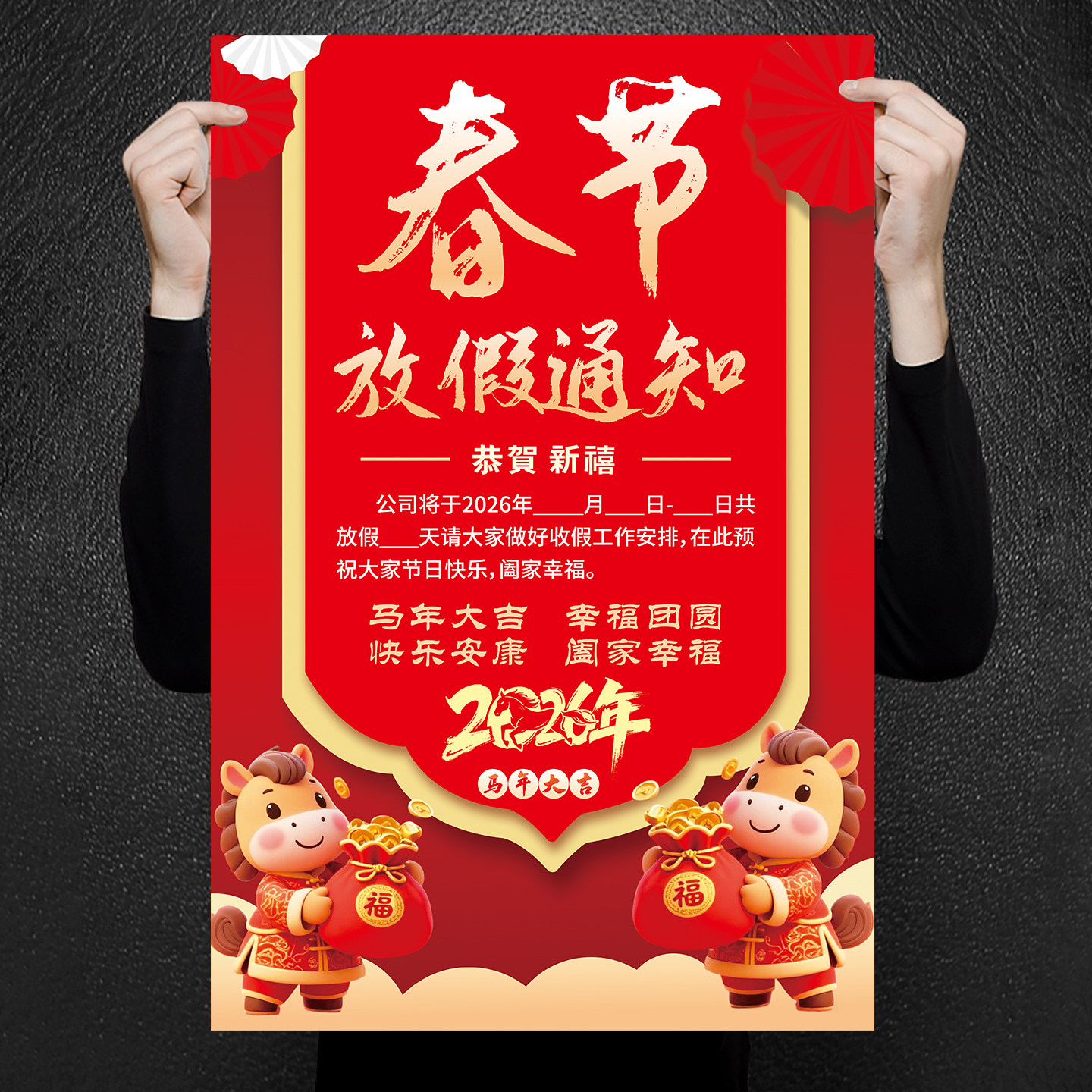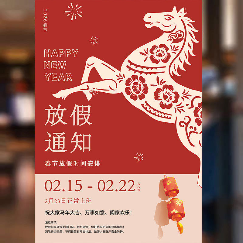 📚 春节放假通知海报2026马年恭贺新春贴纸贴画新年公司单位店铺饭店休班过年休息时间告示墙贴新年放假公告定制