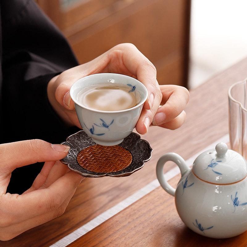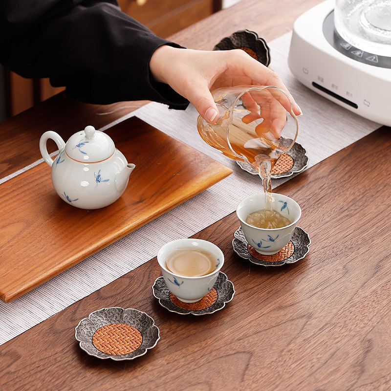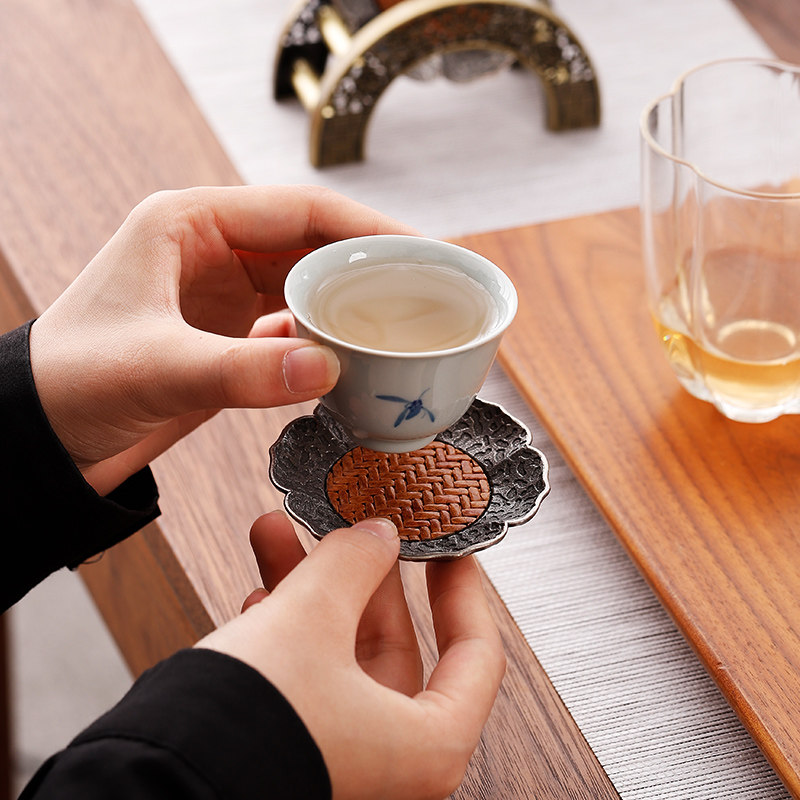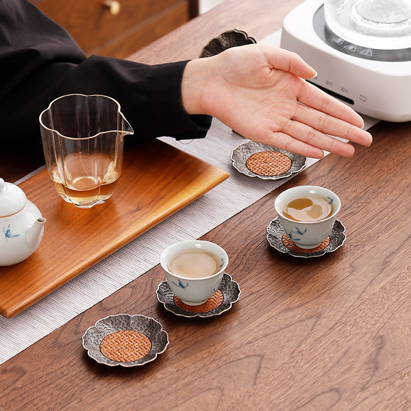 📚 中式仿古银合金茶杯垫竹席隔热茶杯杯托茶碟功夫茶具配件带收纳架