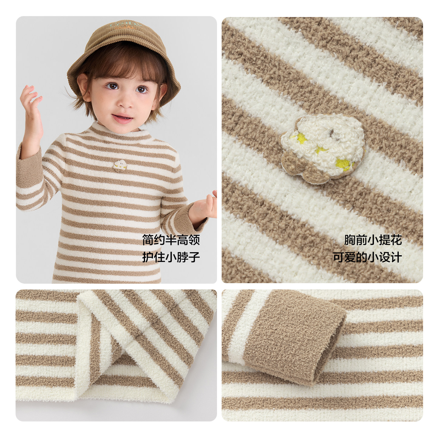 👕面料选择上,细腻的条纹设计、柔软舒适的面料,为宝贝打造了满满的童趣。无论是领口设计还是整体剪裁,都恰到好处地凸显了时尚与可爱。