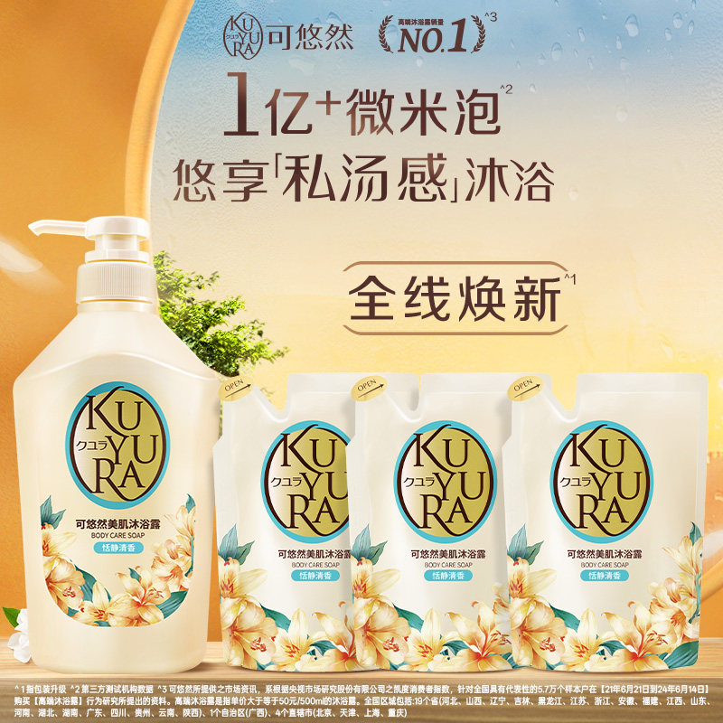 📚 可悠然KUYURA美肌沐浴露(恬静清香)550ml+替换装400ml*3