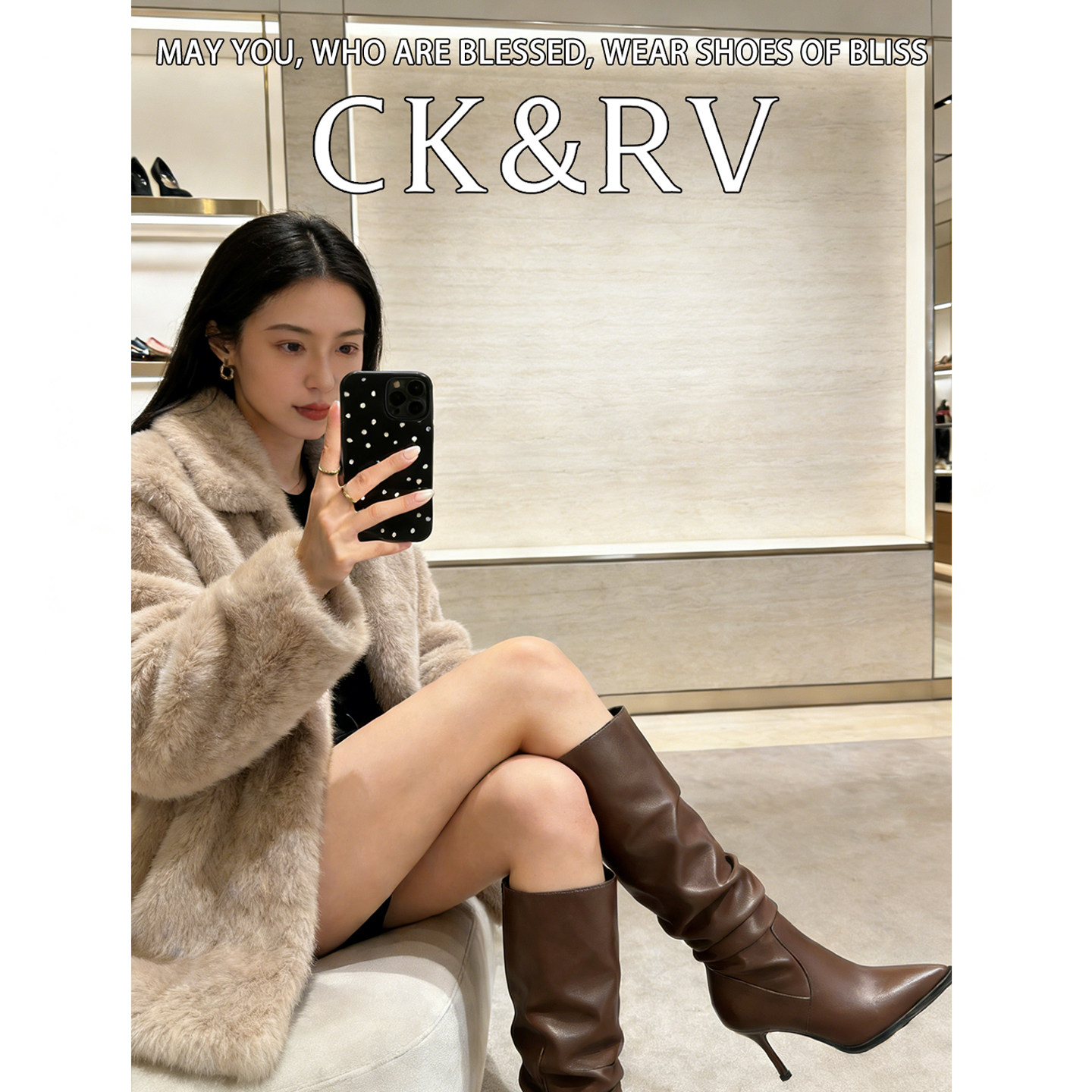📚 黑色小个子尖头高跟鞋女长筒女新款细跟长靴不过膝高筒时装靴女靴