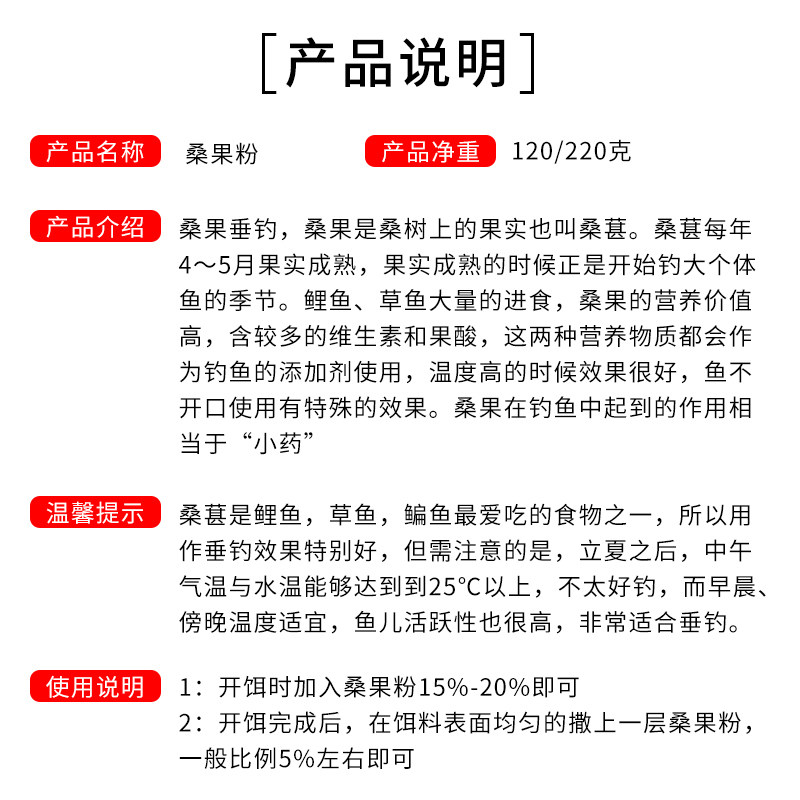 📚 夏季钓鱼专用桑果粉果酸饵料添加剂鱼饵开口剂鲤鱼草鱼野钓诱鱼剂