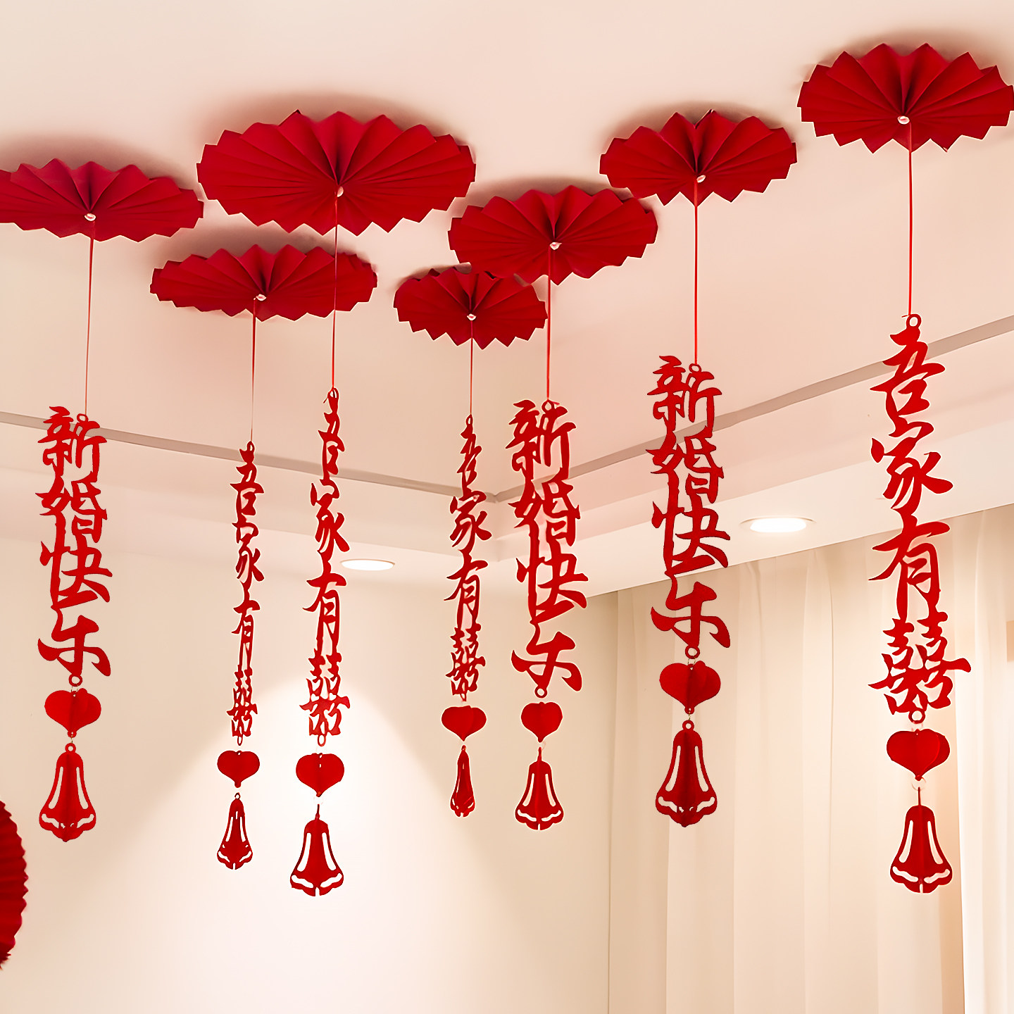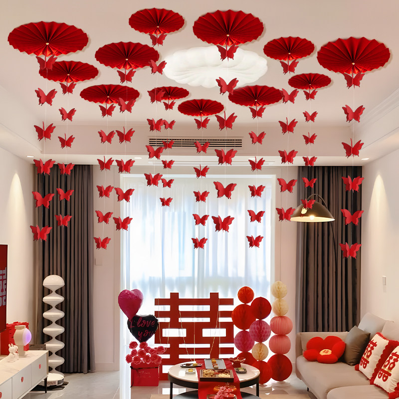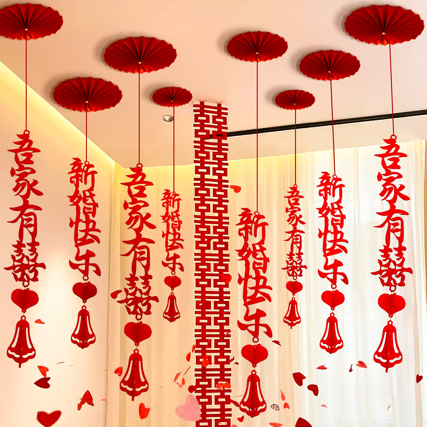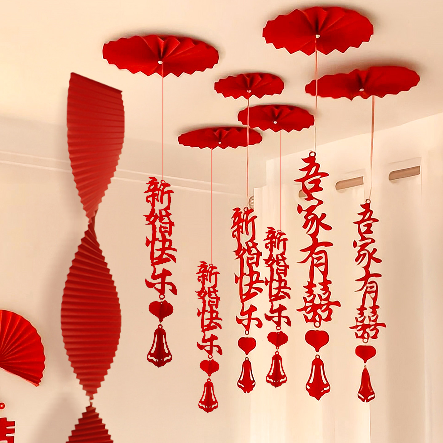 📚 婚房布置喜字扇花结婚新房主卧室客厅天花板装扮吊顶拉花挂饰套装