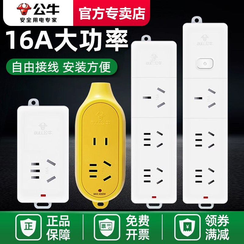 📚 公牛大功率无线插座16a排插4000W不带线插线板热水器空调专用插板