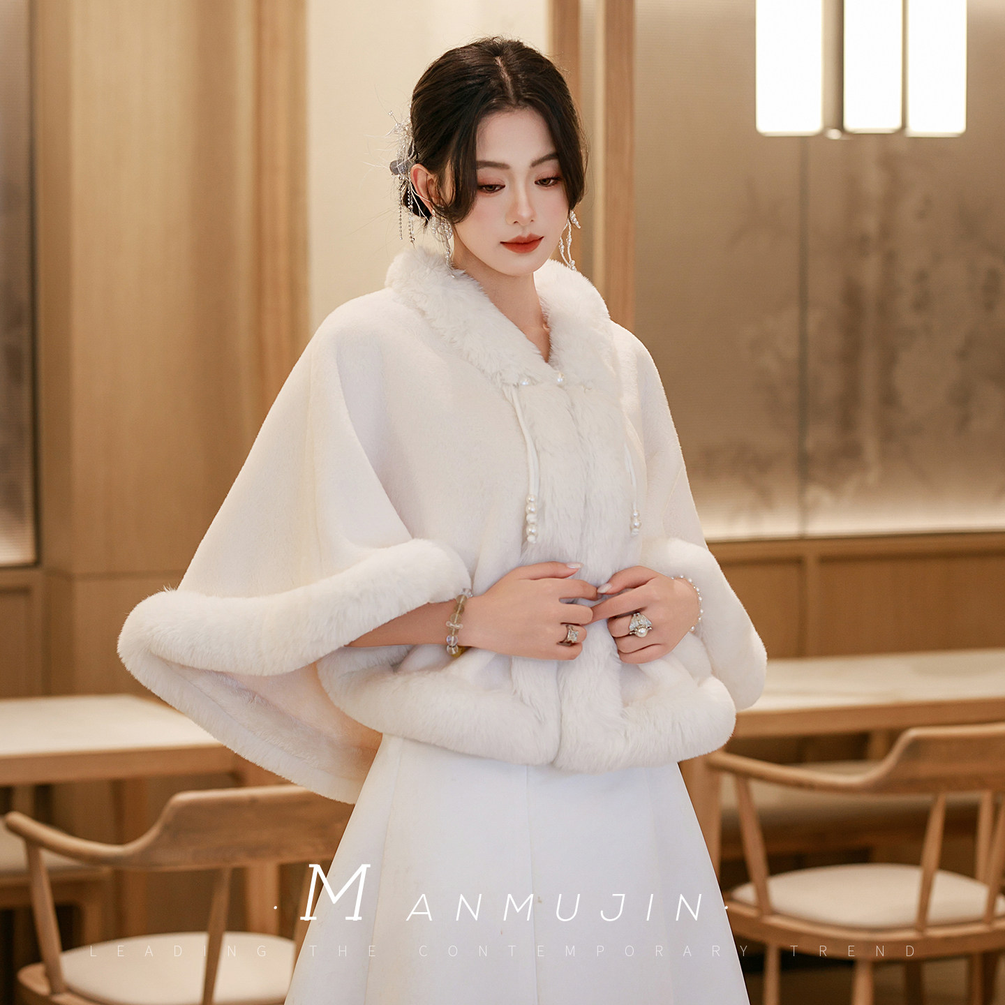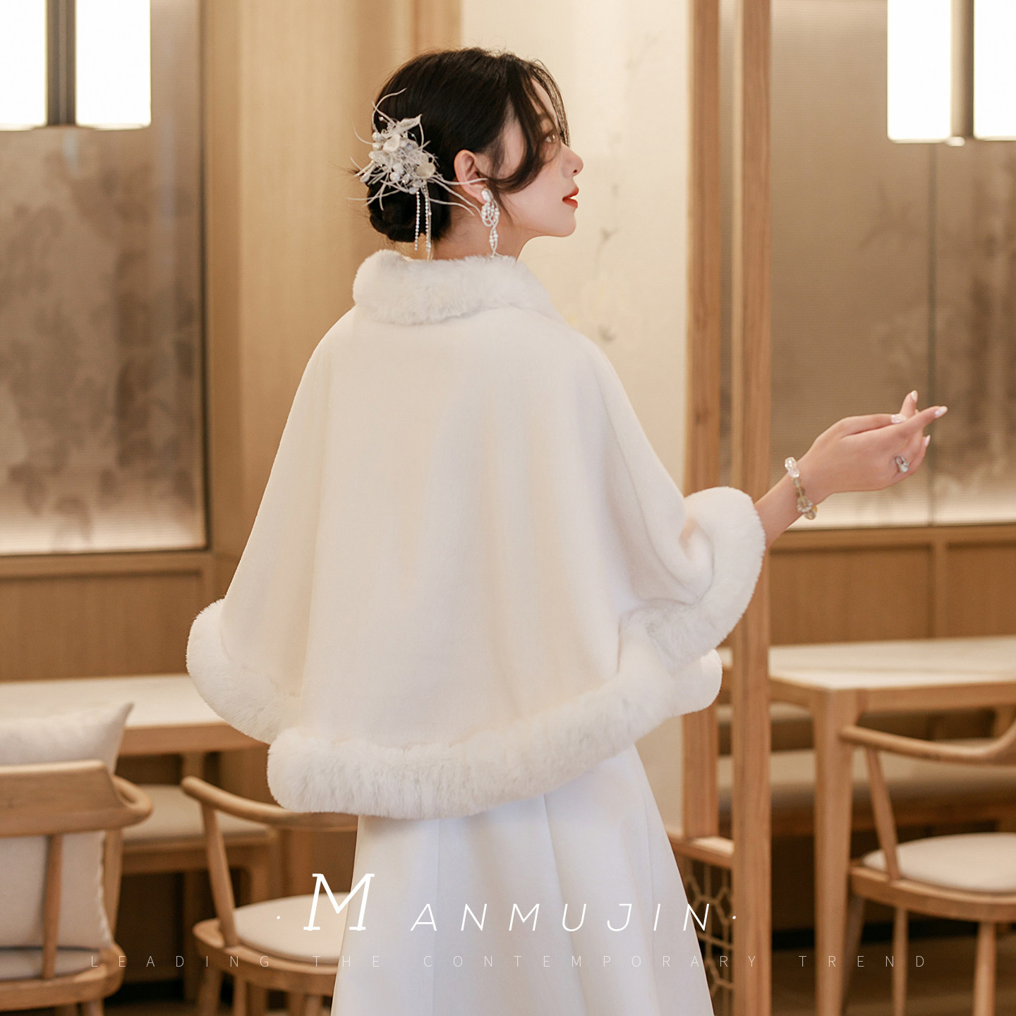 📚 冬季新娘婚纱外套斗篷短披风加厚保暖敬酒服订婚旗袍晚礼服毛披肩