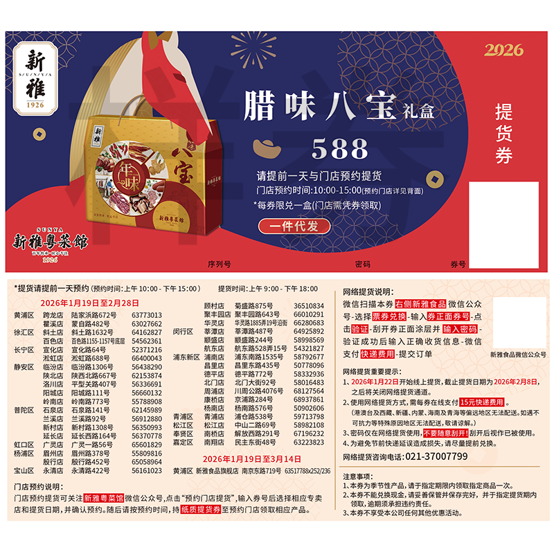 📚 2026新雅腊味八宝礼盒年夜饭提货券半成品菜年夜饭上海门店提货券