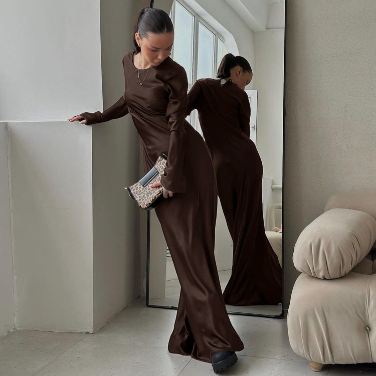 📚 Women Elegant Long Dresses缎面圆领长袖连衣裙气质优雅包臀长裙
