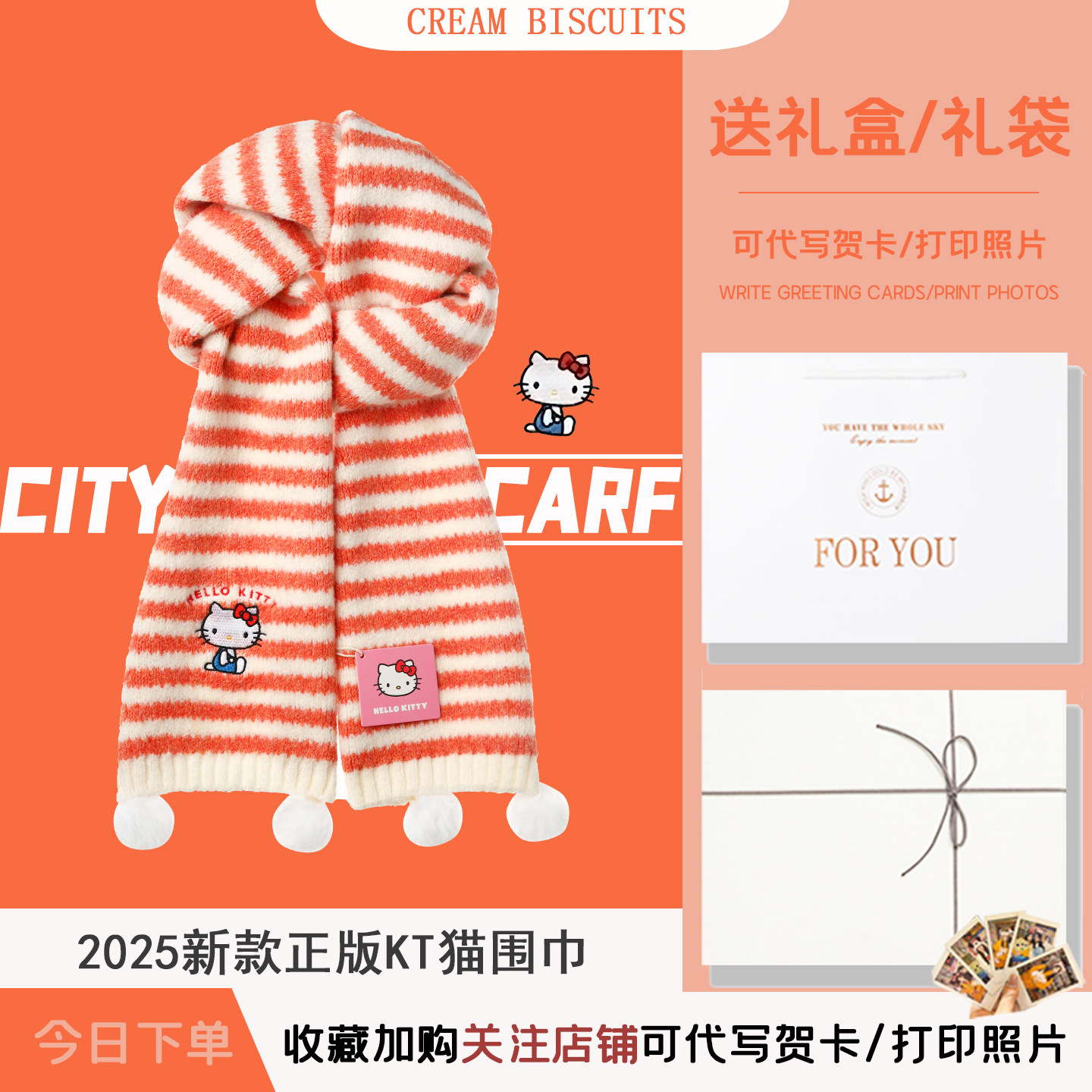 💥超级种草!正版HelloKitty毛球条纹针织围巾女冬新品围脖礼盒,券后仅需59.8💖