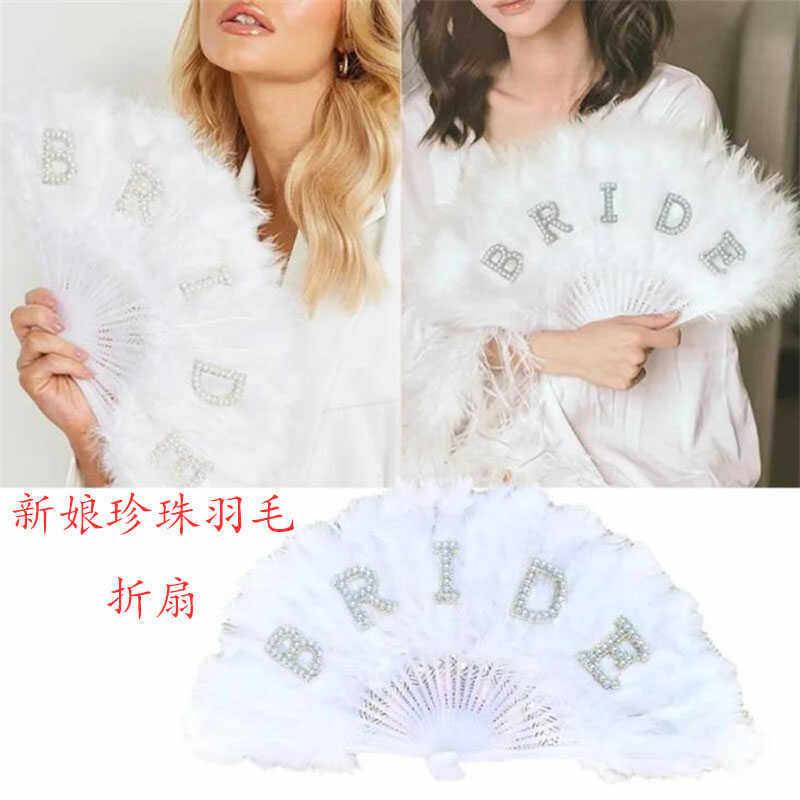 📚 BRIDE新娘珍珠白色羽毛折扇子超仙单身派对婚礼订婚装饰布置礼物