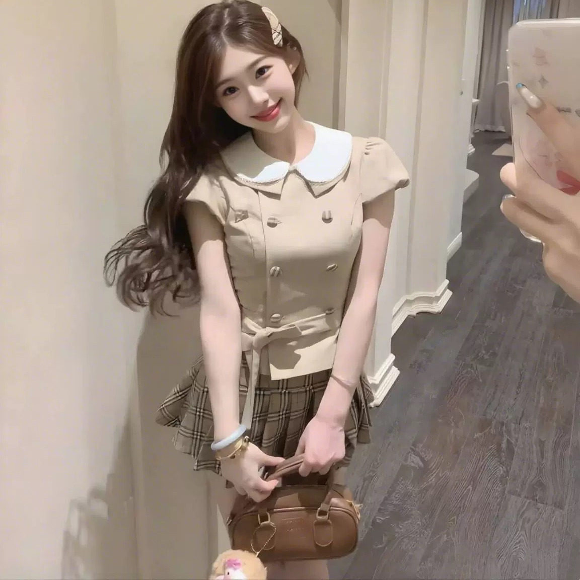 📚 学院风甜美奶杏撞色娃娃领短袖上衣女夏格纹百褶裙两件套装小个子