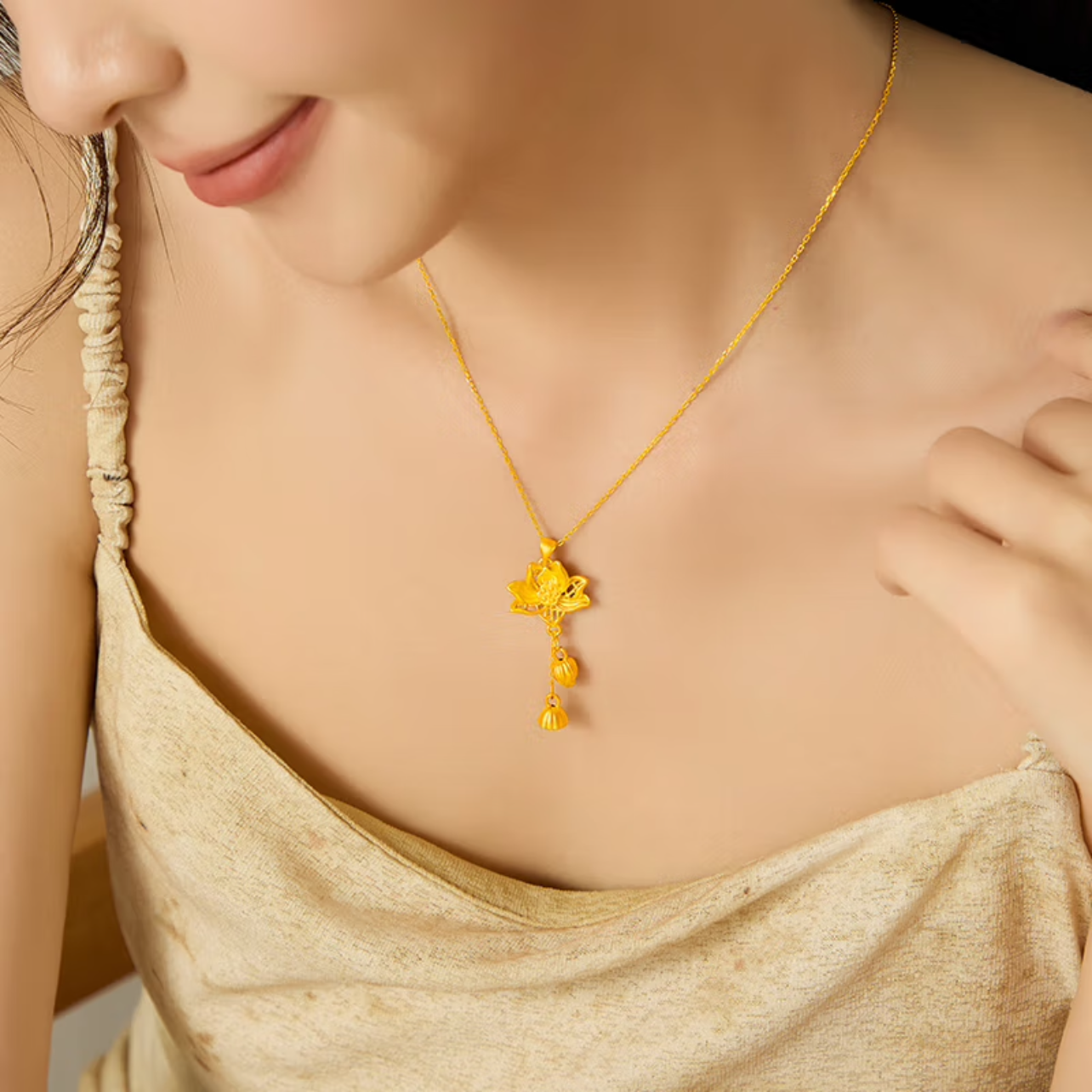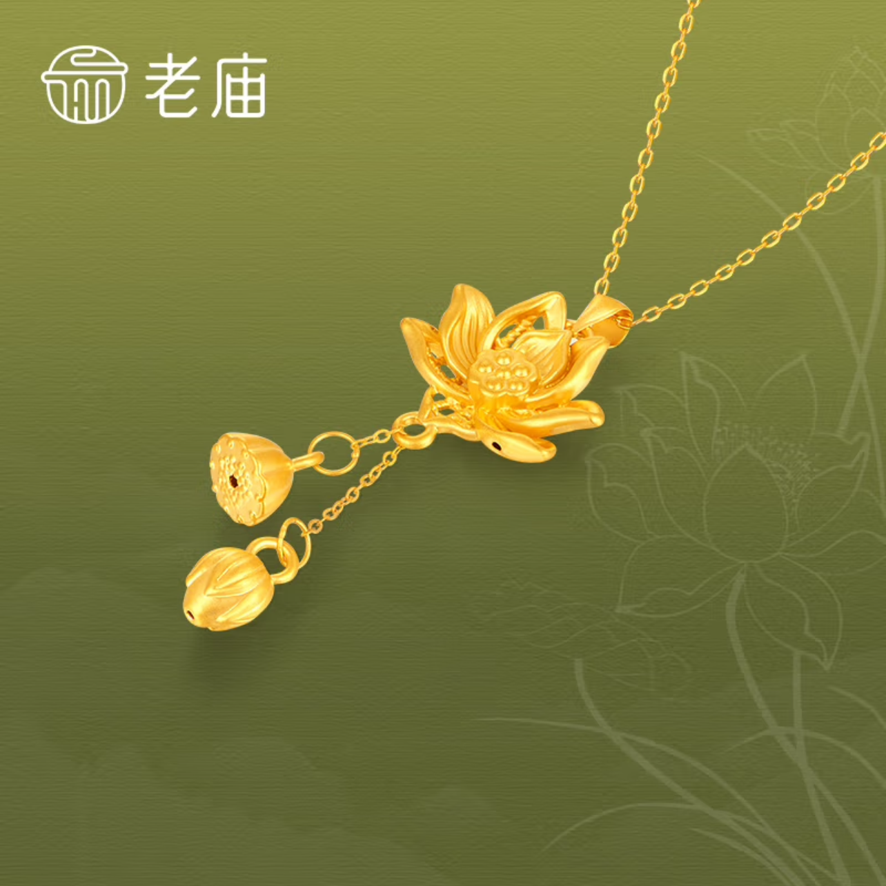 📚 老庙黄金足金莲花两世欢项链女款24k纯金莲蓬吊坠生日礼物送女友