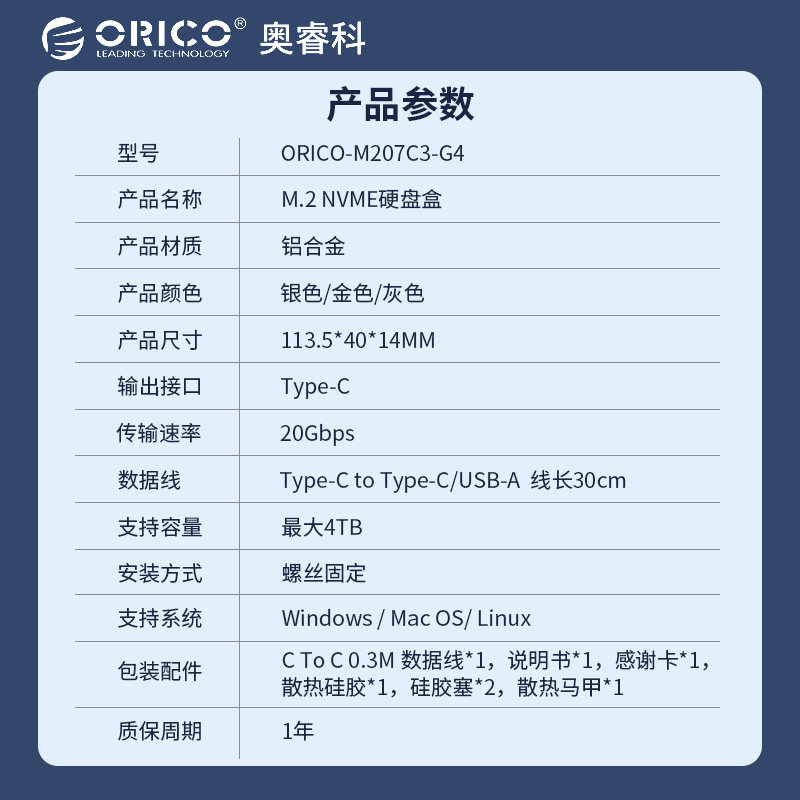 📚 奥睿科(ORICO)M.2 NVME移动硬盘盒SSD固态硬盘盒20Gbps M207C3-G4
