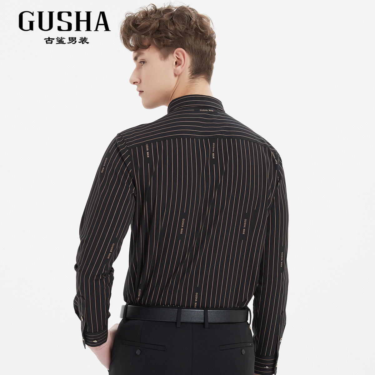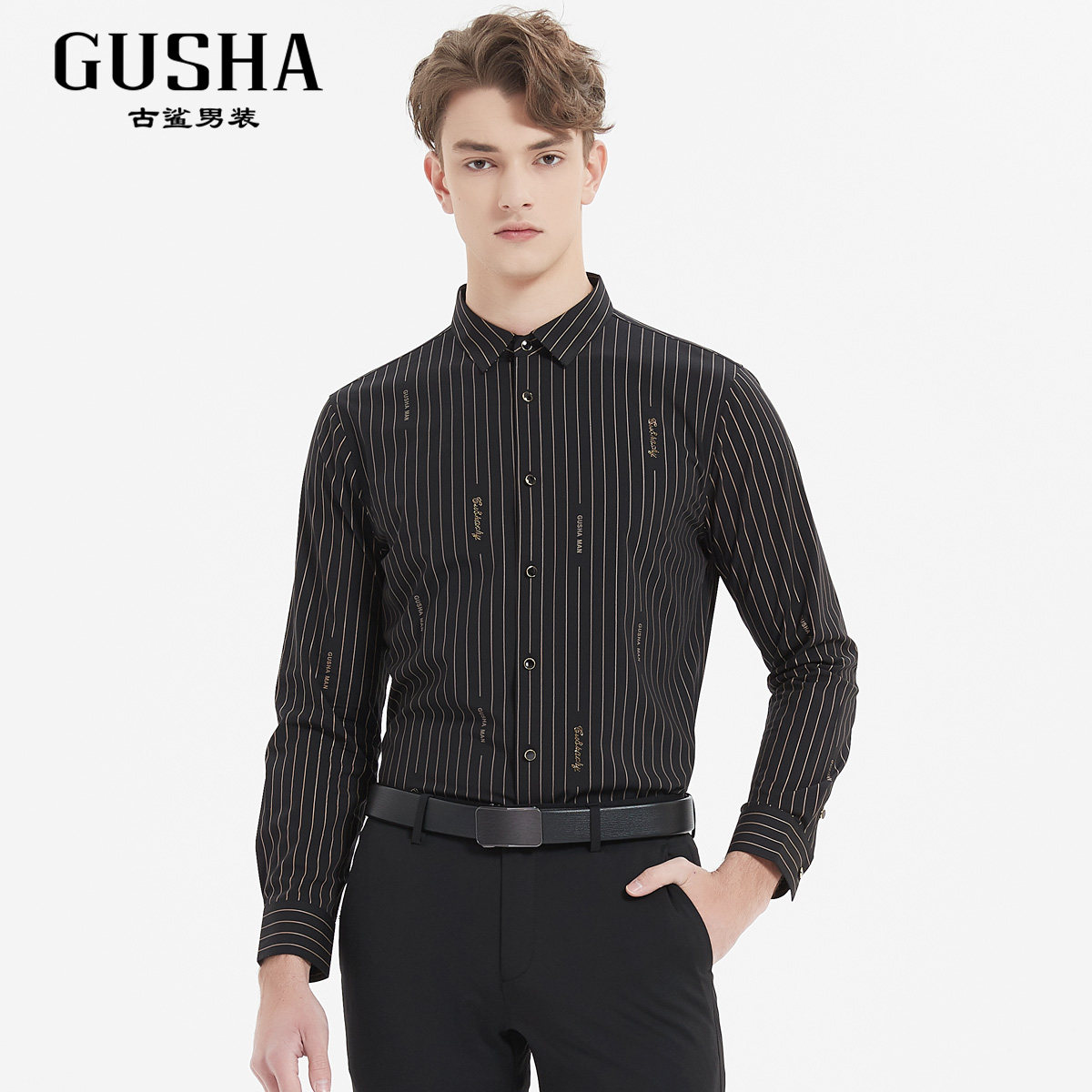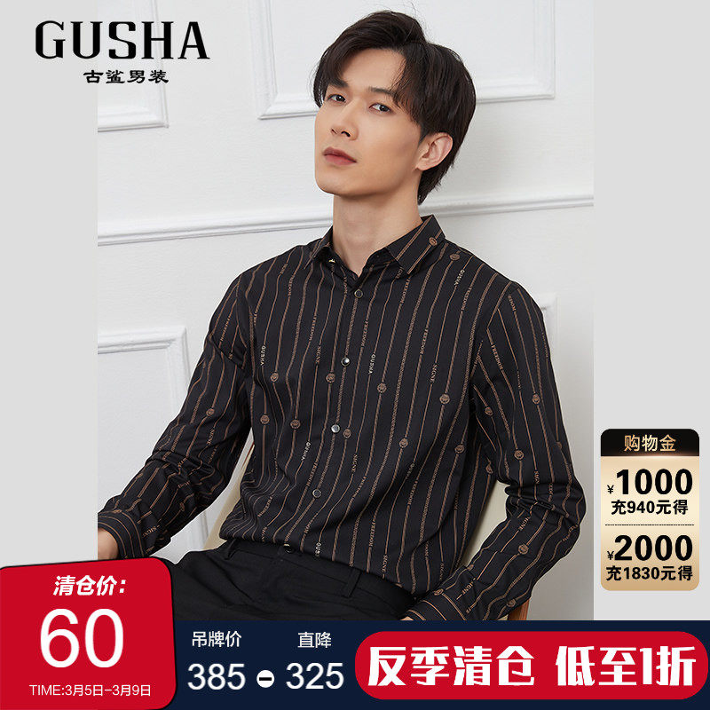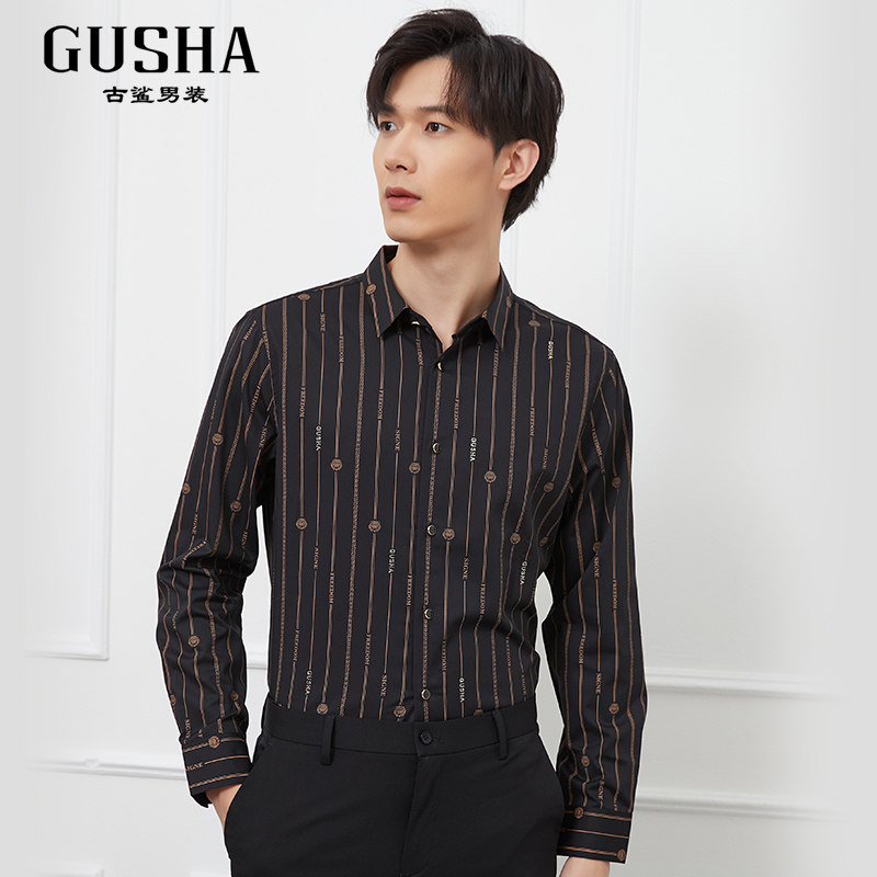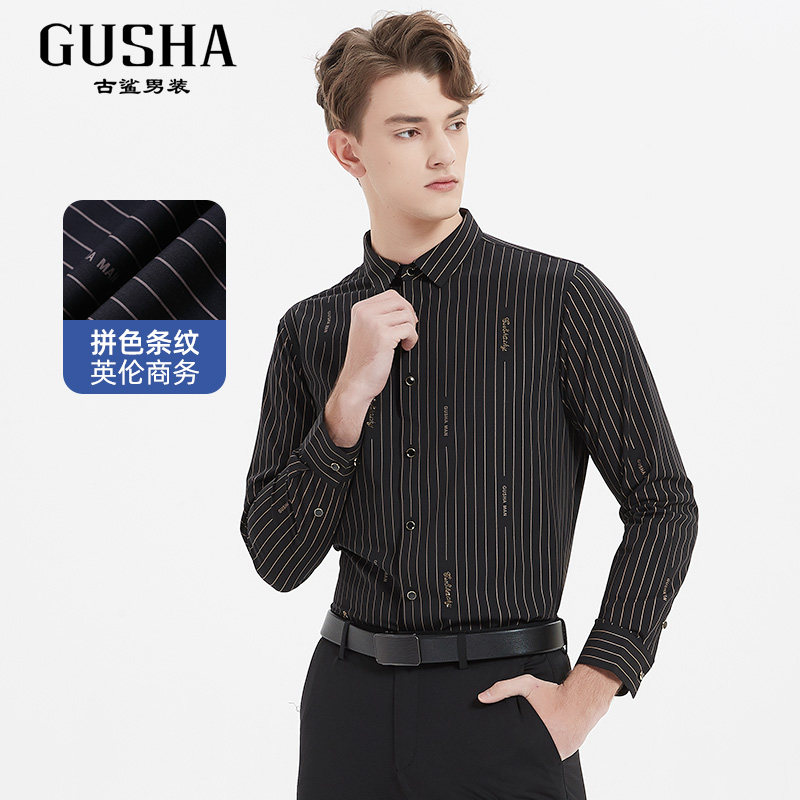 📚 【清仓】古鲨黑色卡其竖条纹长袖衬衣男英伦绅士风修身衬衫春装新