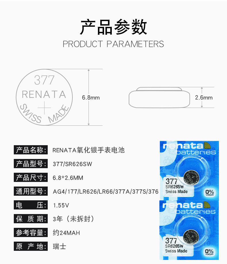 📚 RENATA瑞士原装进口SR626SW手表电池377适用卡西欧氧化银纽扣电子