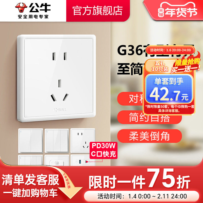 📚 公牛插座旗舰店墙壁开关空调10A16A插座五孔电源面板家用G36白