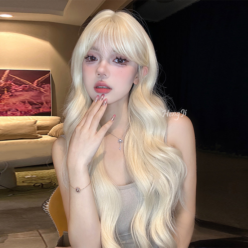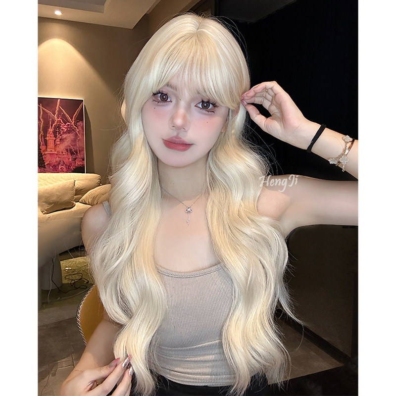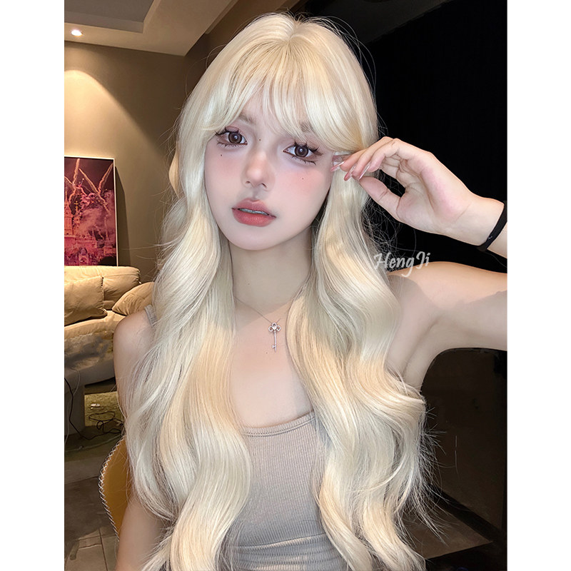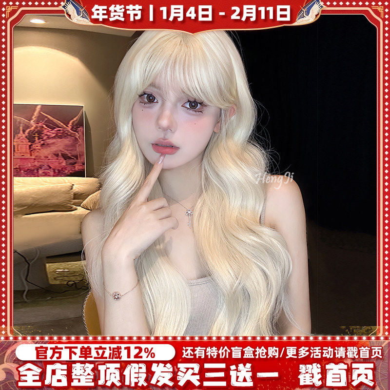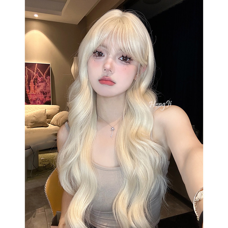 📚 哼唧假发女长发中分齐刘海大波浪长卷发浅金米白仿全真人发全头套