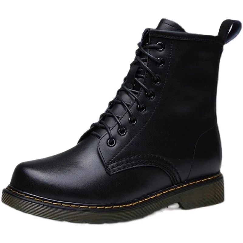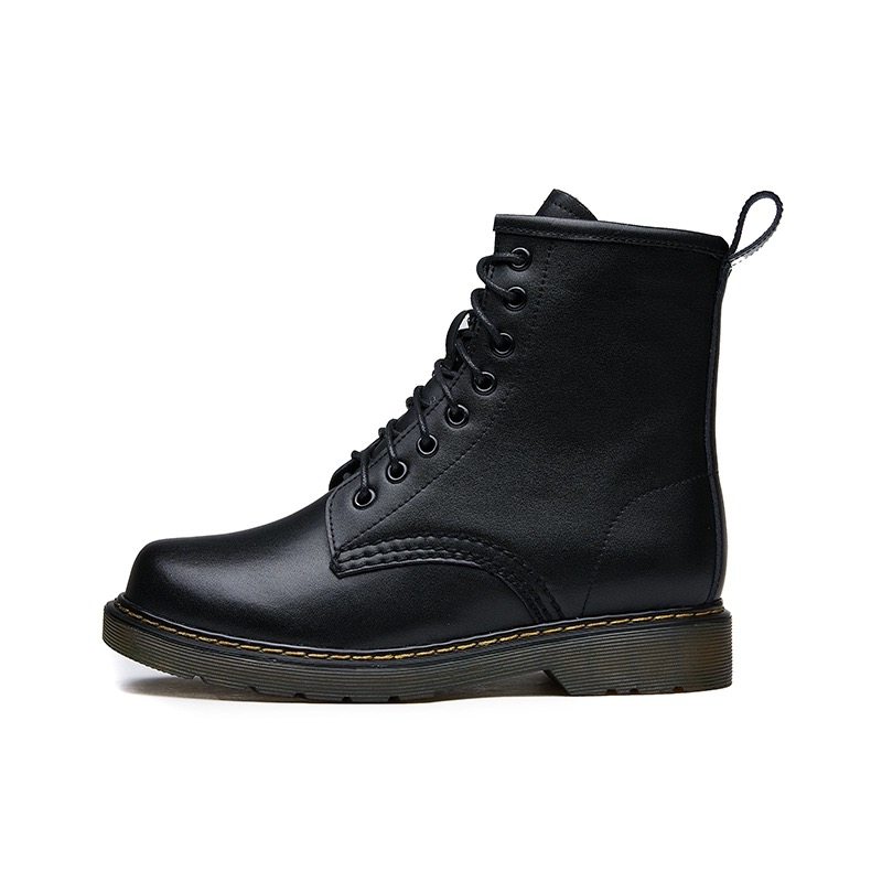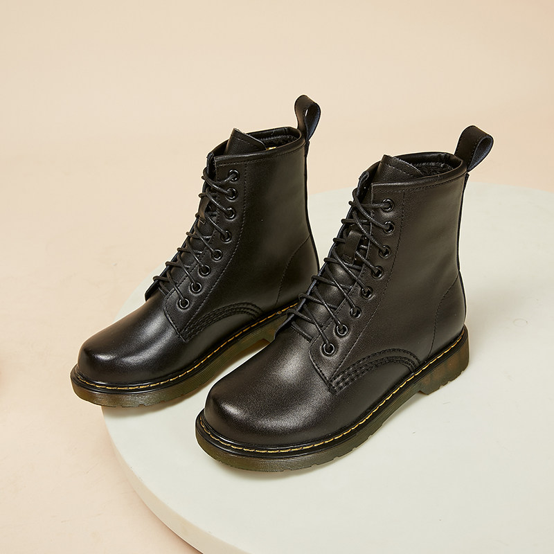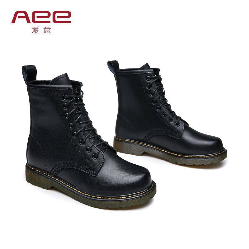 📚 短靴加绒冬季Aee/爱意绑带低跟骑士靴女圆头4121505001马丁靴牛皮