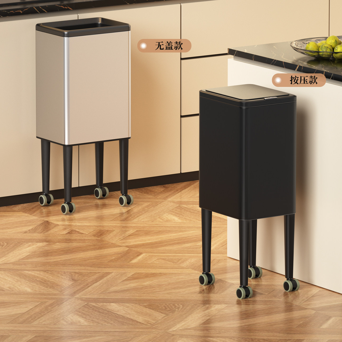 📚 厨房专用免弯腰垃圾桶家用高脚不锈钢大容量带轮高个子新款可移动