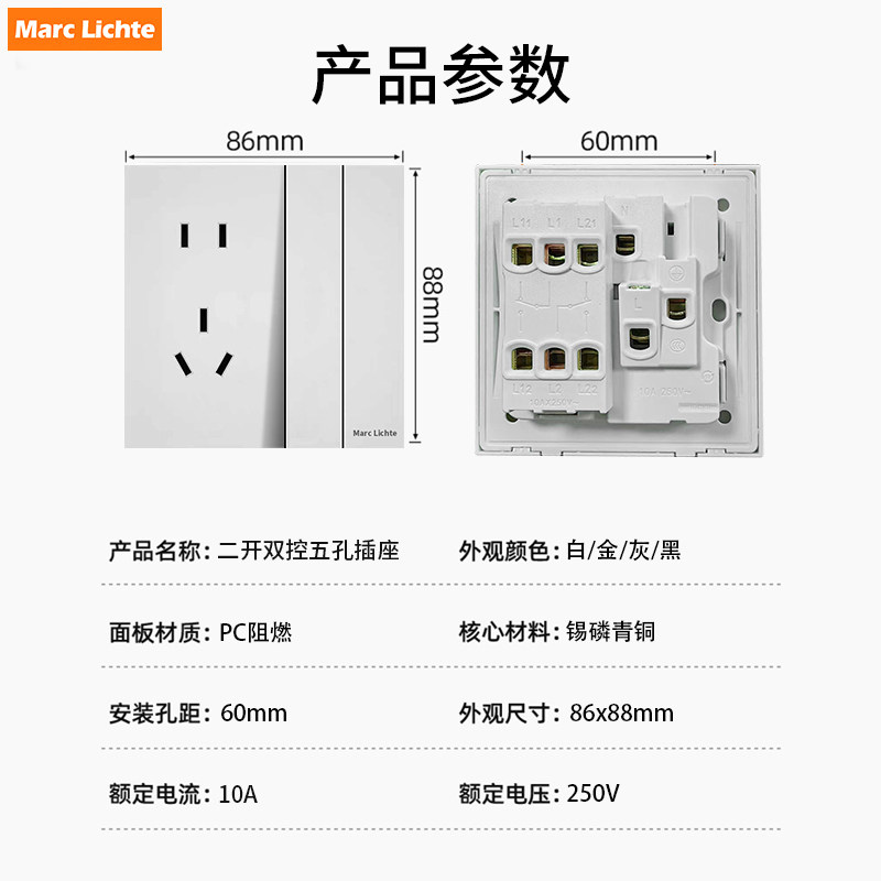 📚 二开五孔双控86型暗装二三插座带二位开关双联双开大板2开5孔面板