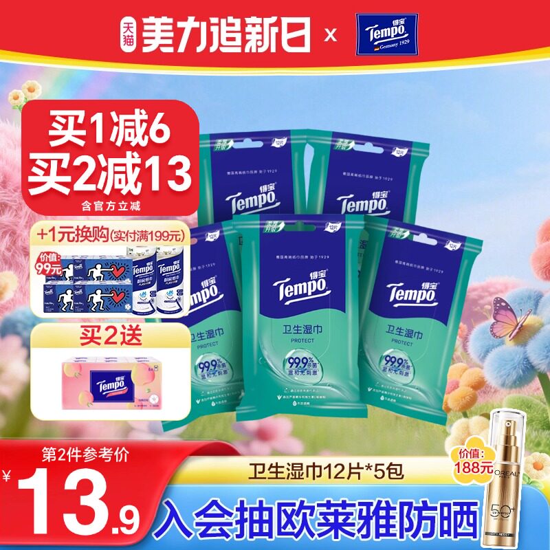📚 【新旧混发】Tempo得宝12片*5小包便携装卫生湿纸巾德宝免洗手