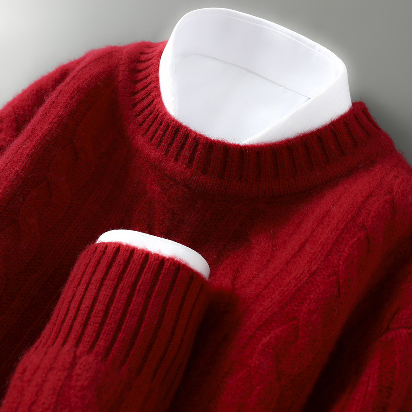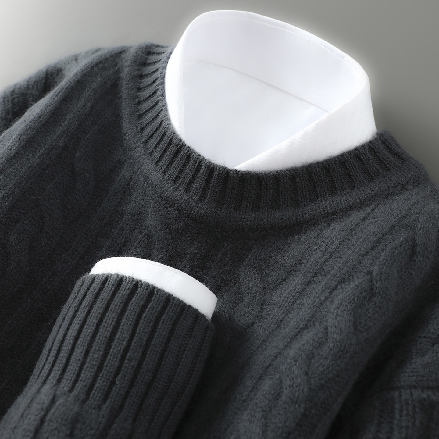 📚 双股加厚100%纯羊毛衫男圆领套头宽松毛衣冬季休闲扭花针织羊绒衫