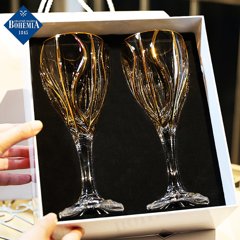 📚 捷克BOHEMIA进口水晶玻璃描金红酒高脚葡萄酒杯酒具对杯礼盒套装